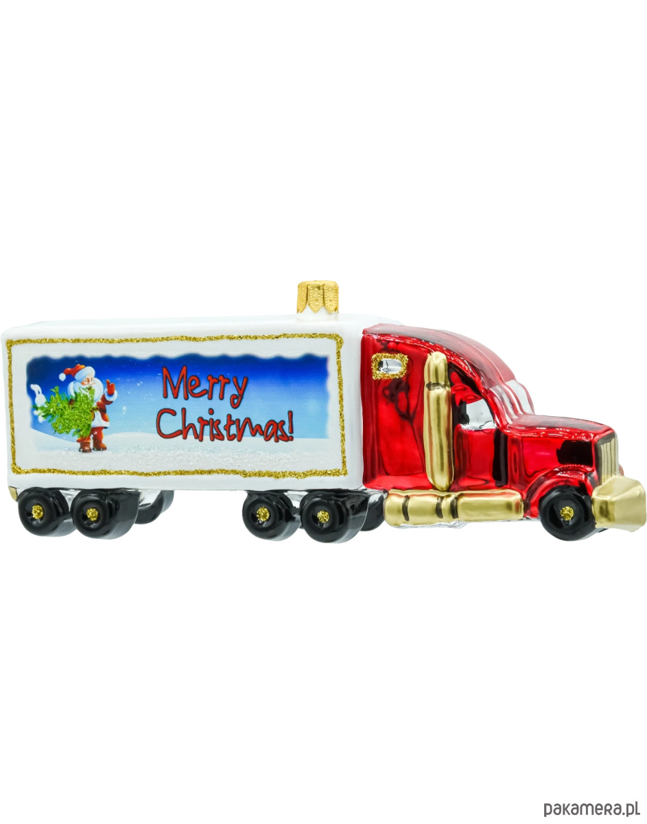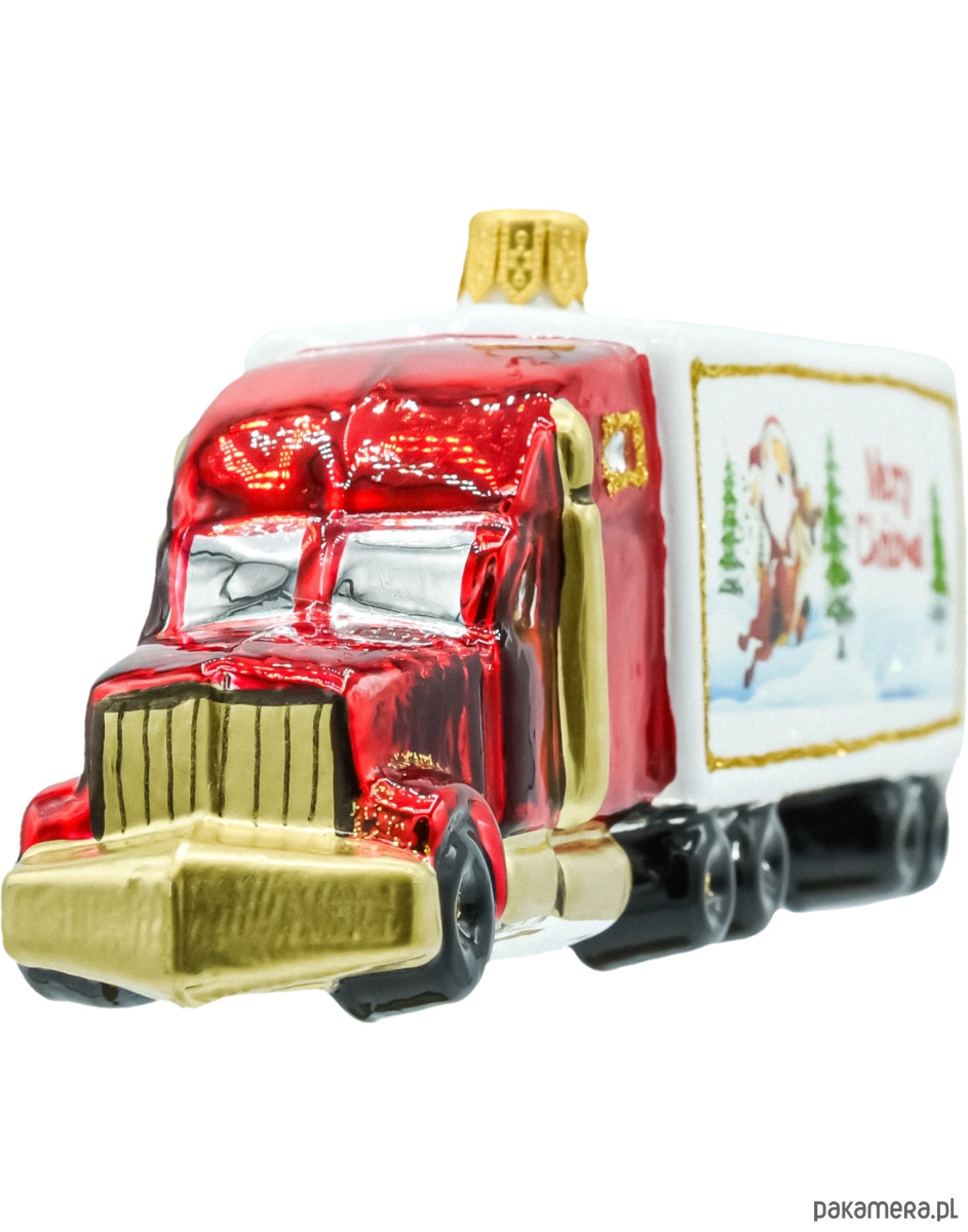 Efektowna, ręcznie wykonywana bombka choinkowa w kształcie amerykańskiej ciężarówki. Kabina w głębokiej czerwieni ze złotymi akcentami i połyskiem pięknie odbija światło lampek, a biała naczepa zdobiona dwustronnym motywem świątecznym („Merry Christmas”, Święty Mikołaj, renifer, choinki) tworzy na choince małą, świąteczną scenkę. To idealna ozdoba dla fanów motoryzacji, kierowców zawodowych i wszystkich, którzy lubią oryginalne, rzemieślnicze dekoracje ze szkła.