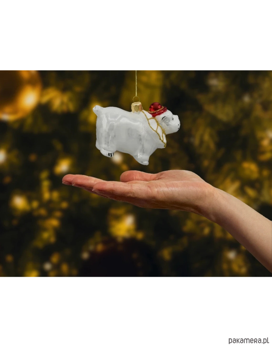 To ozdoba choinkowa ze szkła dmuchanego, ręcznie zdobiona, idealna dla miłośników zwierząt, fanów ras buldogów, kolekcjonerów lub osób, które chcą dodać choince nieco humorystycznego akcentu. Bombka jest lekka, trwała i wyposażona w złotą zawieszkę, dzięki której bezpiecznie zawiśnie na każdej gałązce.