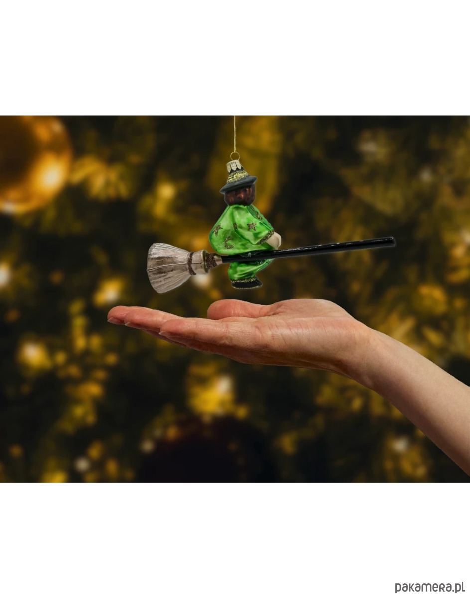 Wnieś na choinkę odrobinę magii! Ta szklana bombka choinkowa – Czarownica na miotle to ręcznie dmuchana i ręcznie malowana figurka z polskiej manufaktury. Błyszczący kobaltowy płaszcz zdobiony złotym brokatem i gwiazdkami, czarny kapelusz czarownicy oraz długi, lakierowany kij miotły z metalicznym, „słomianym” zakończeniem tworzą widowiskową ozdobę, która pięknie odbija światło lampek i od razu zwraca uwagę wśród tradycyjnych dekoracji. Złoty kapturek z oczkiem gwarantuje bezpieczne i wygodne zawieszenie na gałązce, girlandzie lub stojaku do bombek.