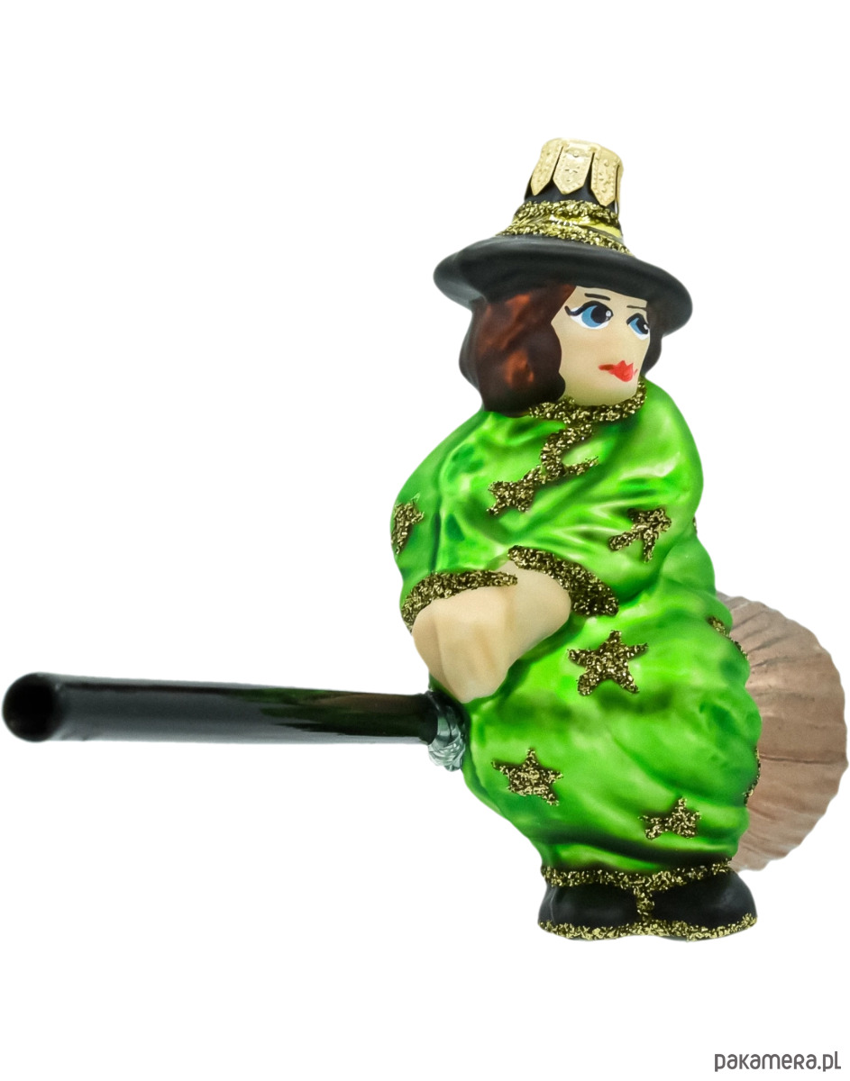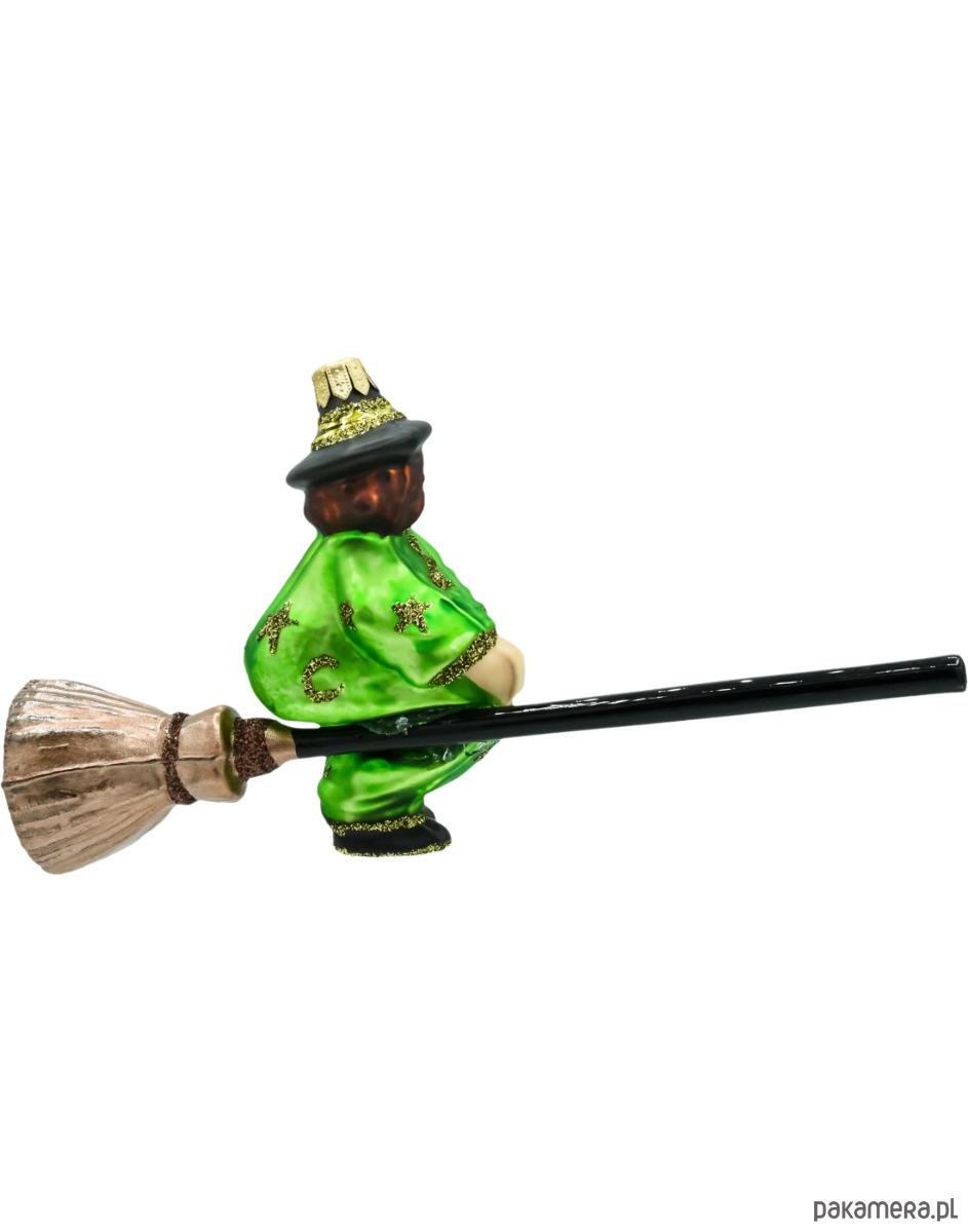 Zdobienia: połyskliwy płaszcz (odcienie żółci/zieleni), złoty brokat, brokatowe gwiazdki, czarny kapelusz z pasami, lakierowana miotła z metaliczną końcówką.