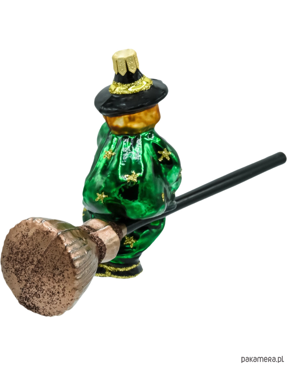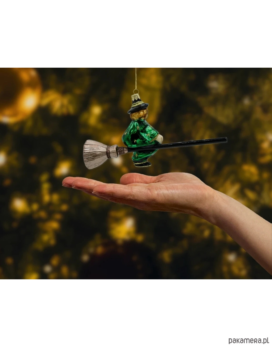 Szklana bombka-figurka Czarownica na miotle to ręcznie robione arcydzieło polskiej pracowni. Każdy egzemplarz jest ustnie dmuchany ze szkła, a następnie ręcznie malowany i zdobiony złotym brokatem. Głęboka zieleń szaty, czarny kapelusz z brokatowym rantem oraz charakterystyczna miotła z długim kijem tworzą efektowną, humorystyczną scenkę, która od razu przyciąga wzrok na choince. To idealna bombka dla fanów baśni, fantasy i… odrobiny psot w świątecznym wystroju.