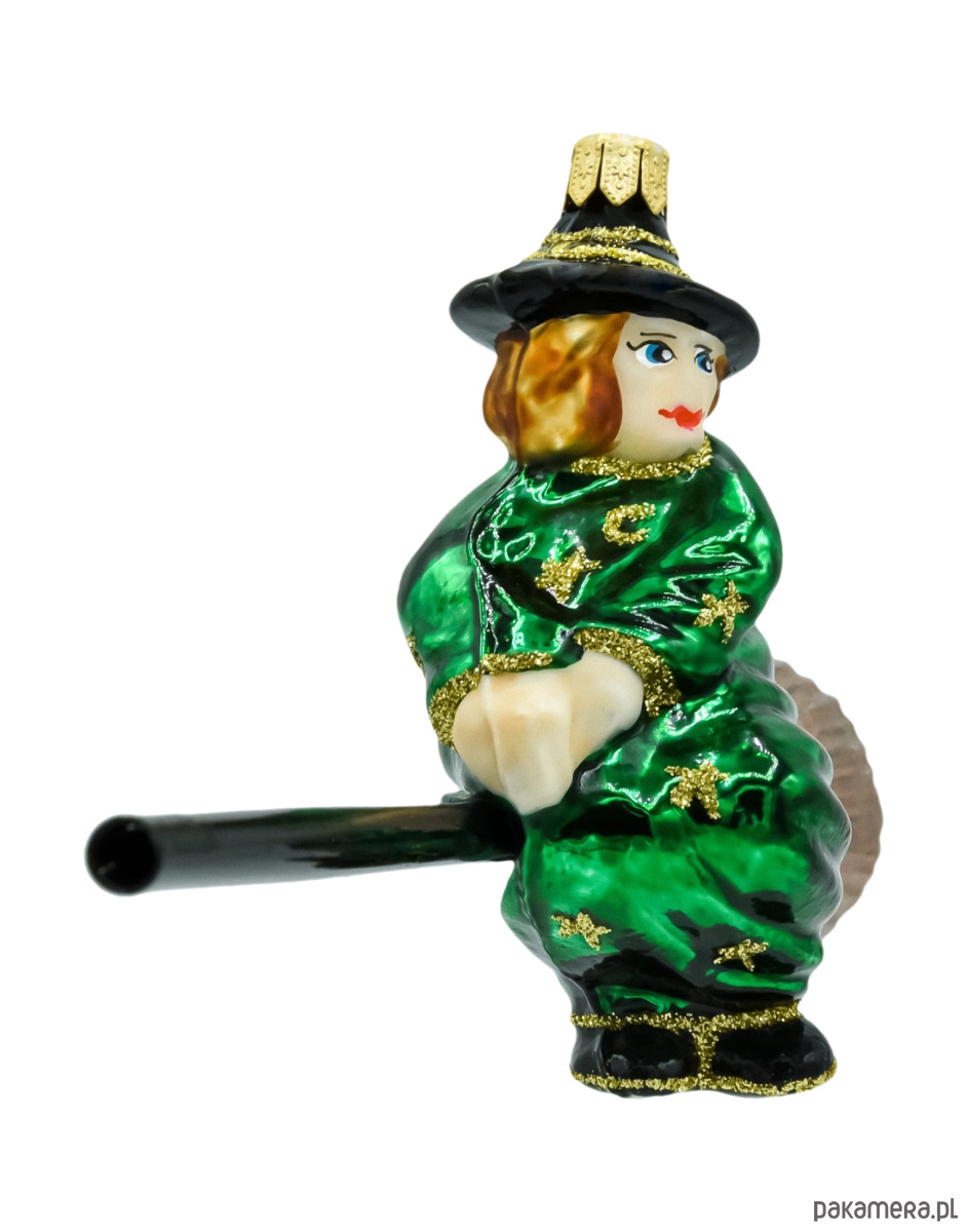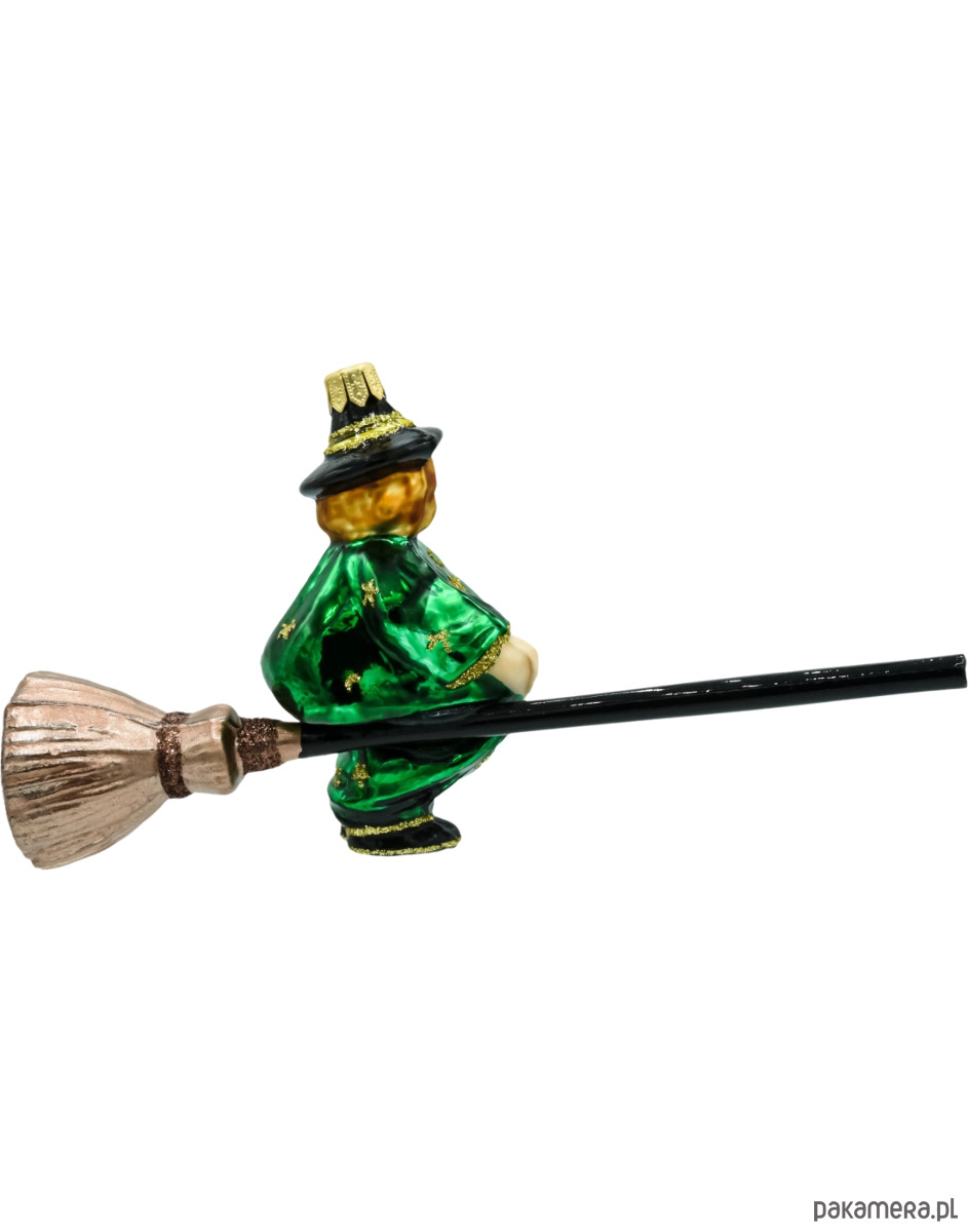 Forma: figurka – czarownica w zielonej pelerynie, w kapeluszu, siedząca na miotle z długim, czarnym kijem.