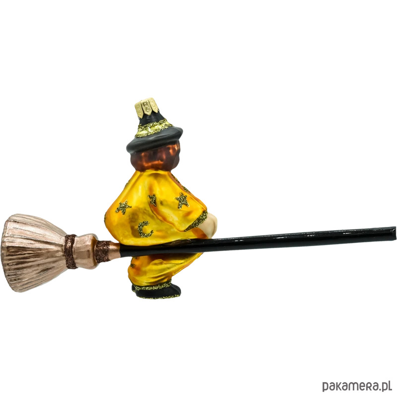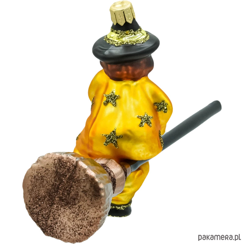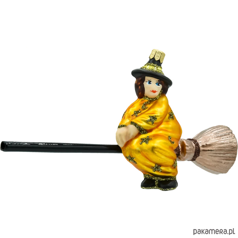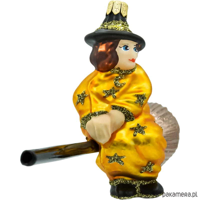 Wprowadź do choinki nutę magii! Ręcznie dmuchana i ręcznie malowana bombka choinkowa w formie czarownicy lecącej na miotle to wyjątkowa, kolekcjonerska ozdoba, która przyciąga wzrok z każdego miejsca na drzewku. Połyskująca żółta szata zdobiona złotym brokatem i gwiazdkami, czarny kapelusz czarownicy oraz długi, lakierowany kij miotły z metaliczną, „słomianą” końcówką tworzą bajkową kompozycję w eleganckim, świątecznym stylu. Złoty kapturek z oczkiem ułatwia szybkie i stabilne zawieszenie na gałązce, girlandzie czy stojaku do bombek.