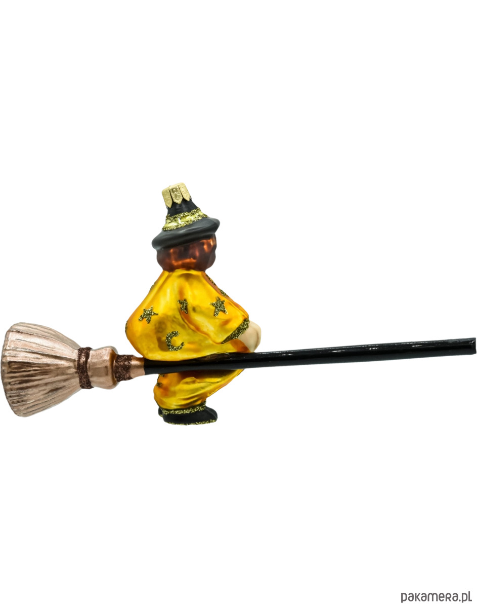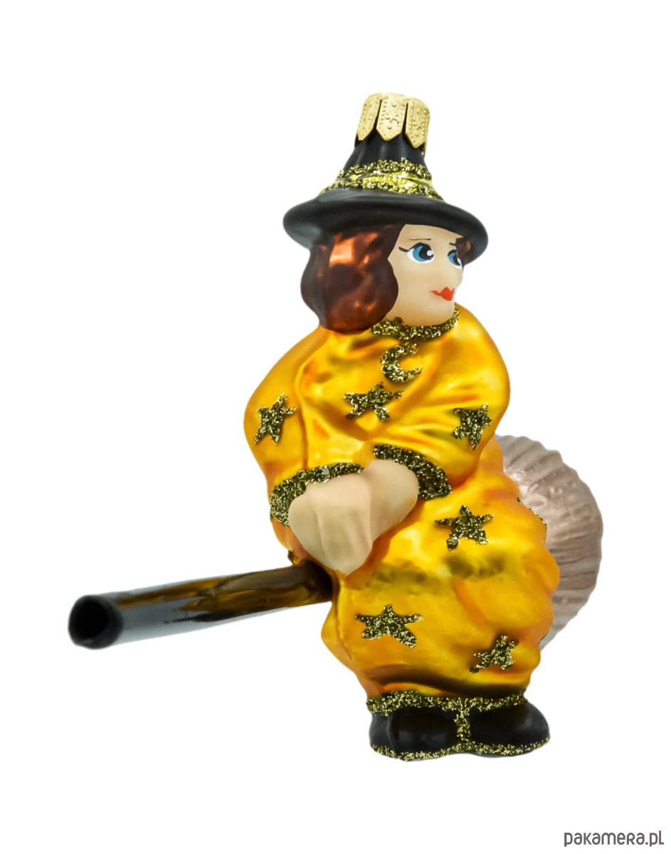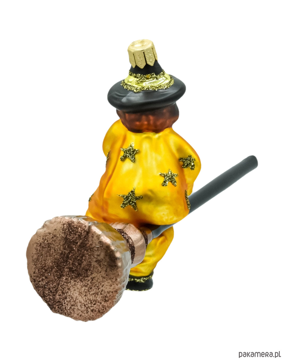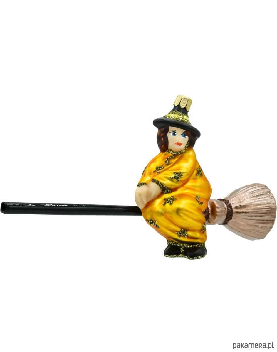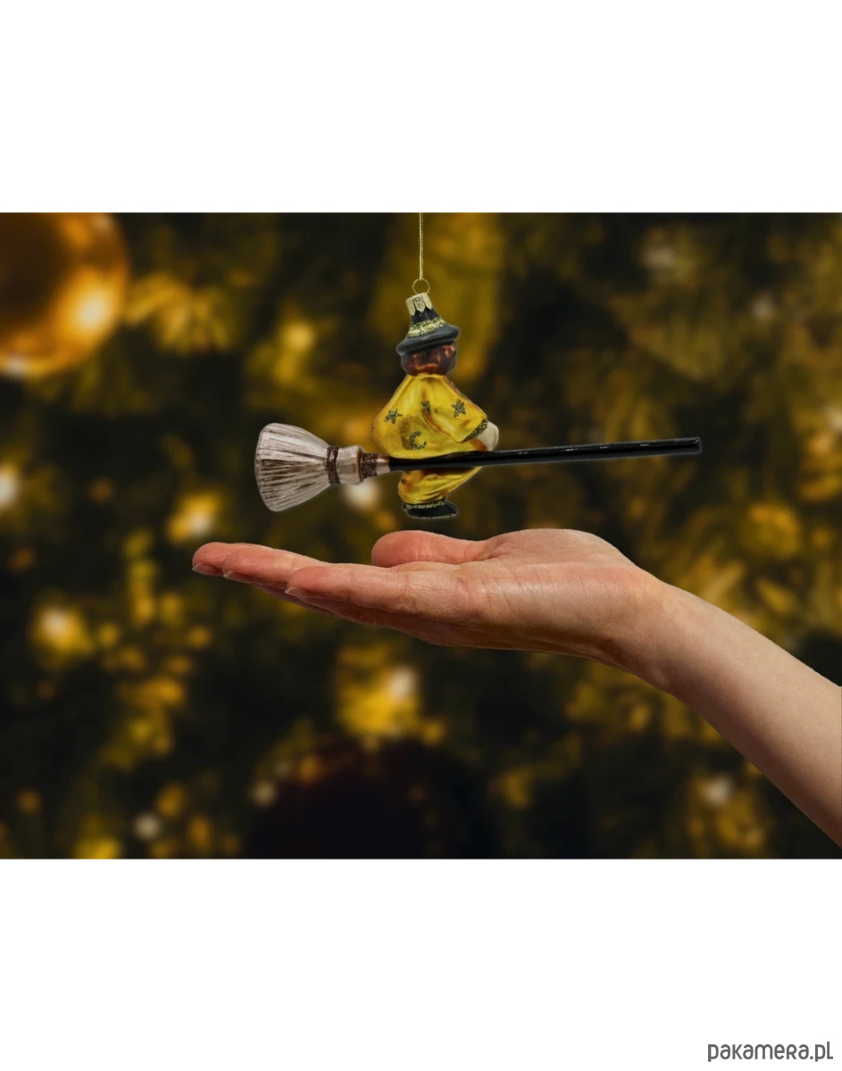 Wprowadź do choinki nutę magii! Ręcznie dmuchana i ręcznie malowana bombka choinkowa w formie czarownicy lecącej na miotle to wyjątkowa, kolekcjonerska ozdoba, która przyciąga wzrok z każdego miejsca na drzewku. Połyskująca żółta szata zdobiona złotym brokatem i gwiazdkami, czarny kapelusz czarownicy oraz długi, lakierowany kij miotły z metaliczną, „słomianą” końcówką tworzą bajkową kompozycję w eleganckim, świątecznym stylu. Złoty kapturek z oczkiem ułatwia szybkie i stabilne zawieszenie na gałązce, girlandzie czy stojaku do bombek.