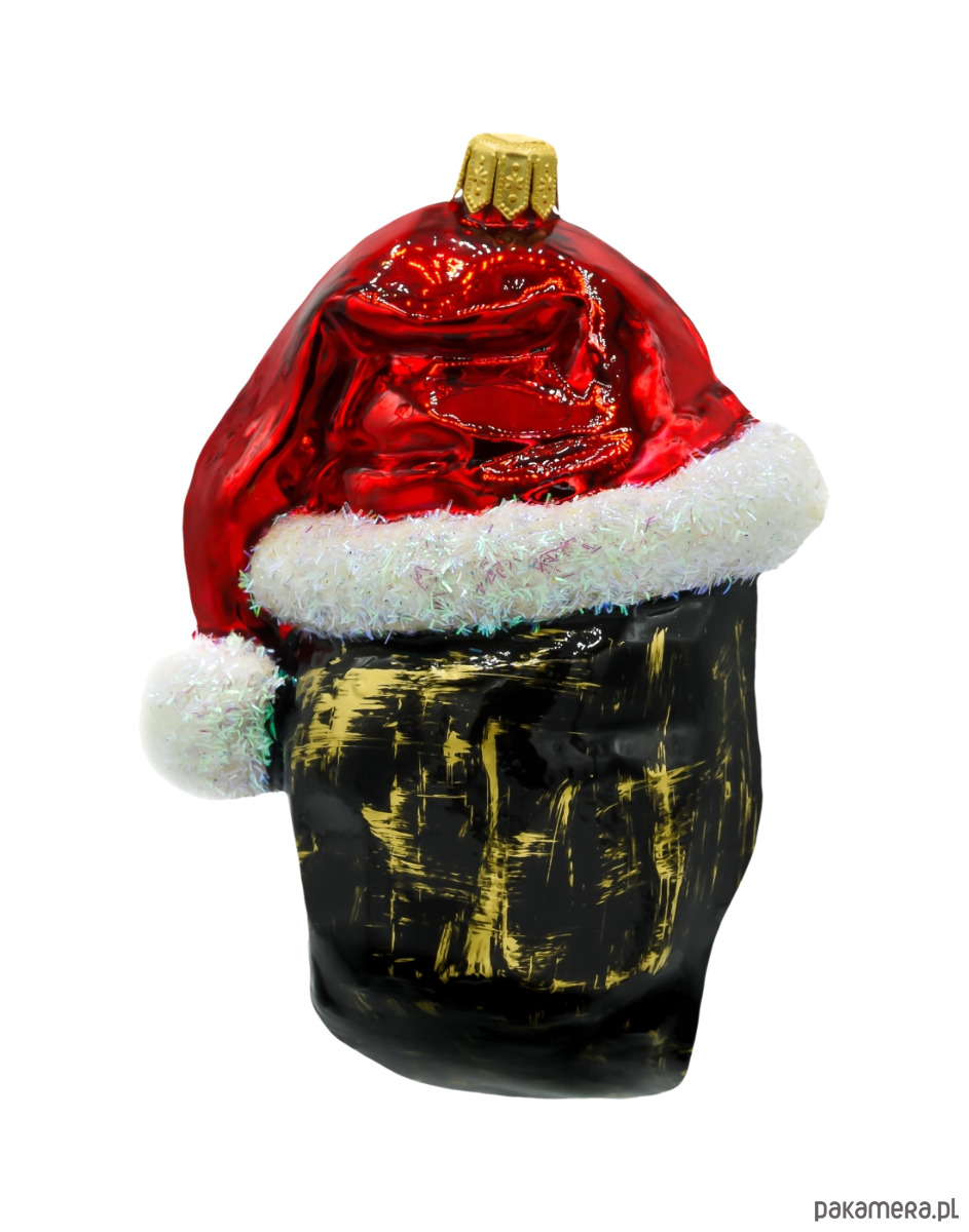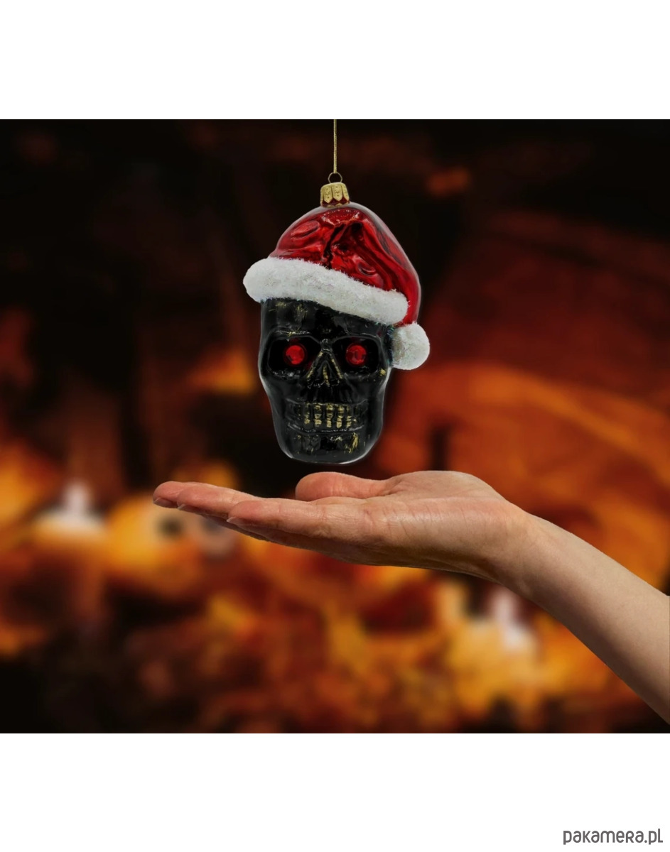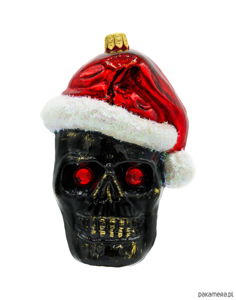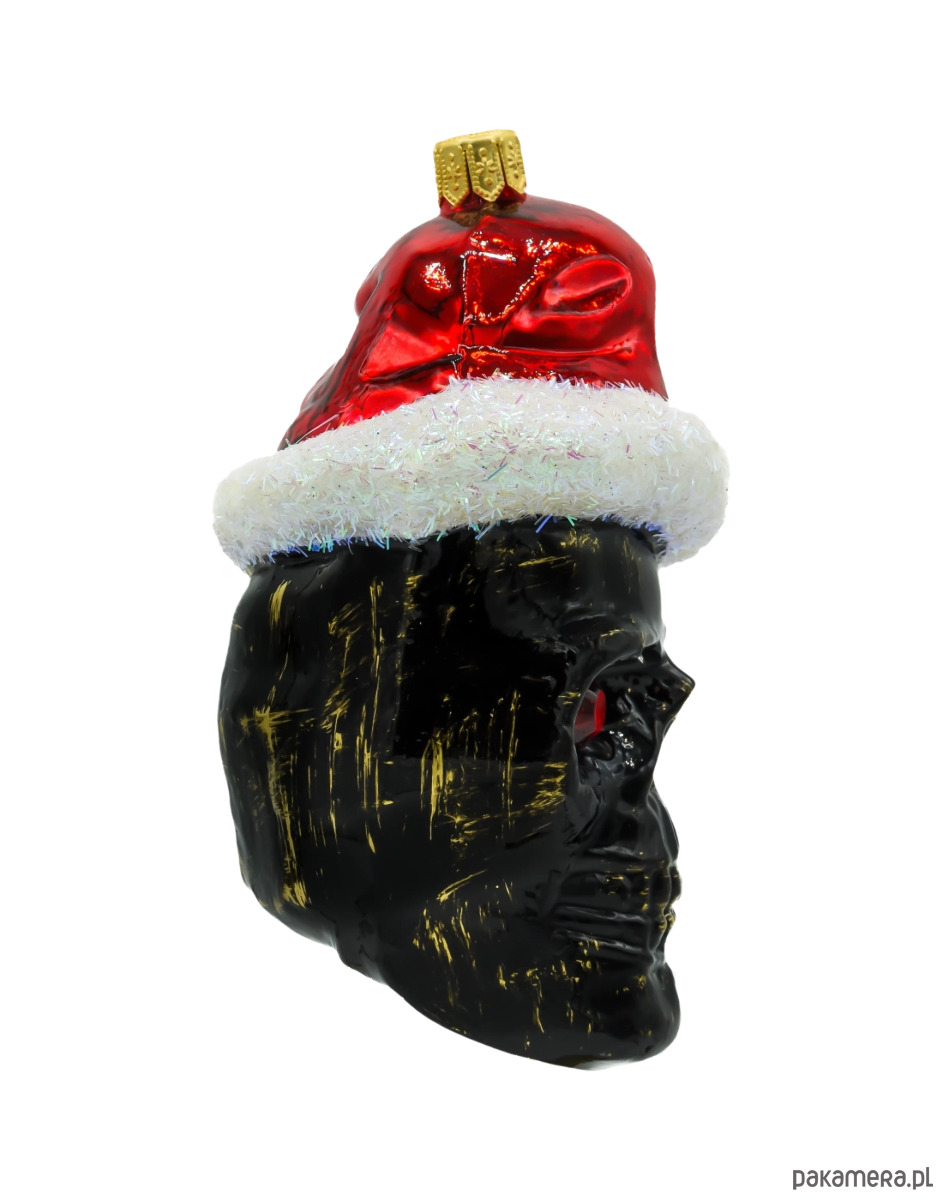 Motyw: Czarna czaszka w czapce Świętego Mikołaja, z czerwonymi oczami i detalami dodającymi ozdobie unikalnego charakteru. Czapka wykonana w intensywnej czerwieni, z białym, puszystym wykończeniem, które nawiązuje do klasycznego stroju Mikołaja.