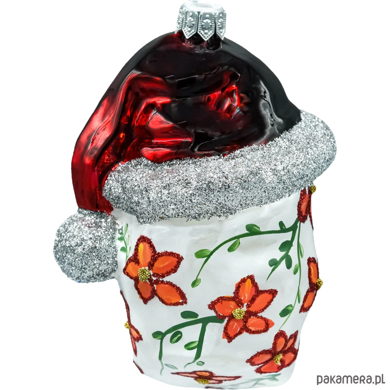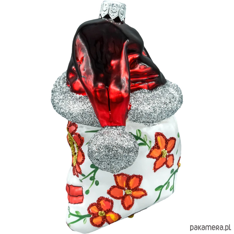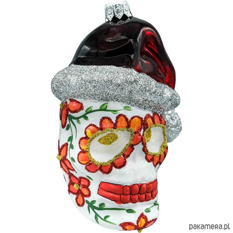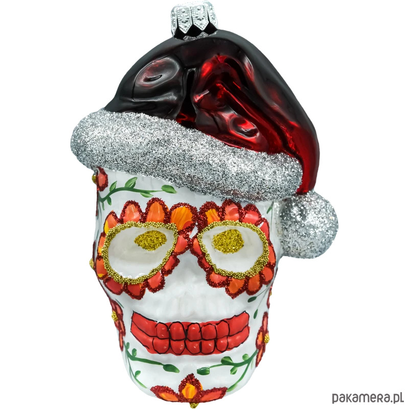 Wyjątkowa, odważna i niezwykle dekoracyjna bombka w kształcie stylizowanej meksykańskiej czaszki „sugar skull” w świątecznej czapce. Ręcznie dmuchane szkło, ręczne malowanie i bogate zdobienia sprawiają, że to mała biżuteria na choinkę – łączy klimat Bożego Narodzenia z kolorową estetyką Día de los Muertos. Na białej, perłowej powierzchni namalowano kwiatowe motywy w czerwieniach i pomarańczach, konturowane brokatem i mikrokoralikami. Głowę wieńczy połyskująca czapka Mikołaja: głęboka czerwień ze srebrnym, brokatowym mankietem i pomponem, które pięknie łapią światło lampek.