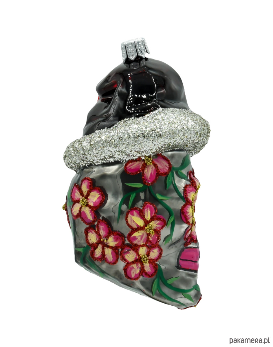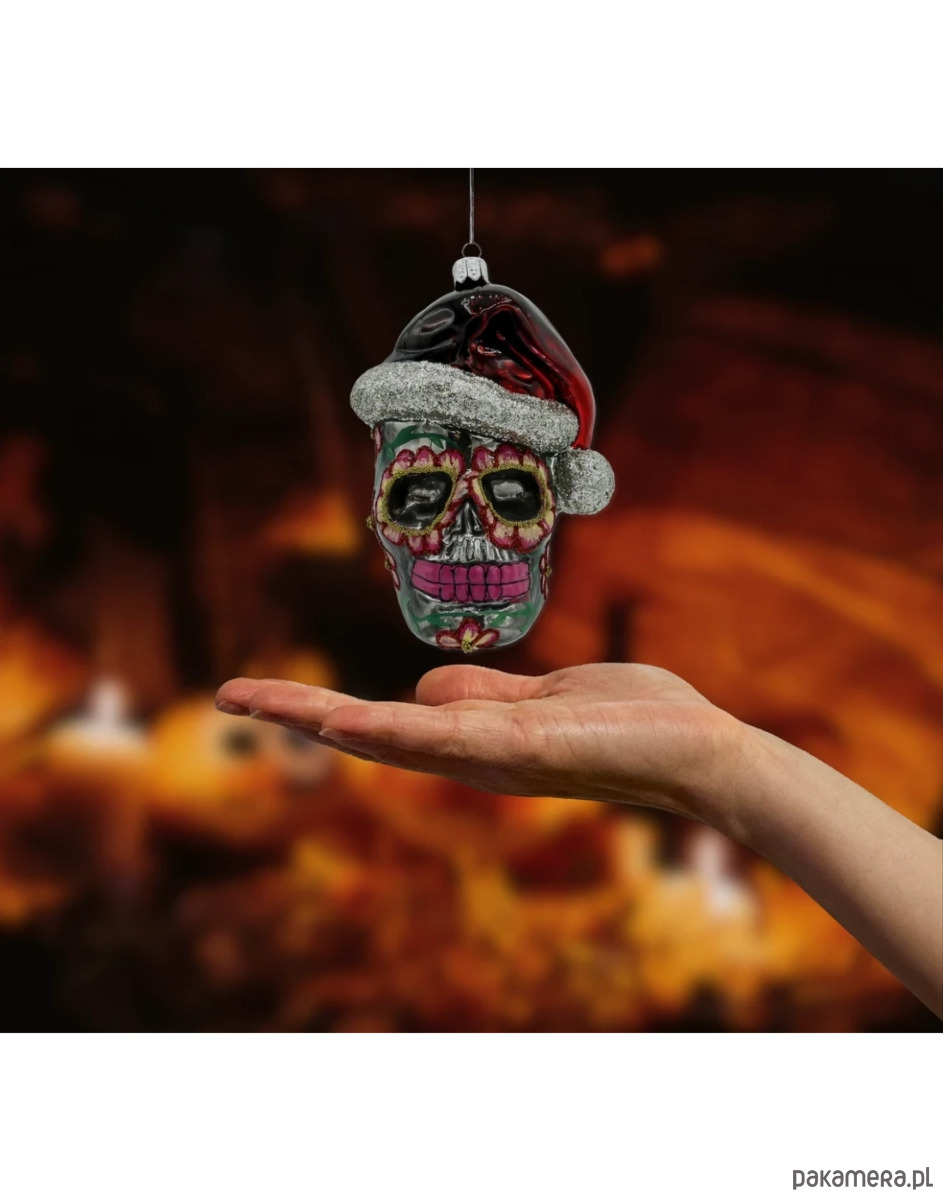 Całość zachwyca misternym wykonaniem i pełnią kontrastów: błyszcząca powierzchnia czaszki odbija światło choinkowych lampek, a detale w postaci brokatowych kwiatów i konturów tworzą efekt trójwymiarowości i głębi. To bombka idealna dla miłośników odważnych ozdób, alternatywnej estetyki oraz świątecznych aranżacji z nutą ekstrawagancji.
