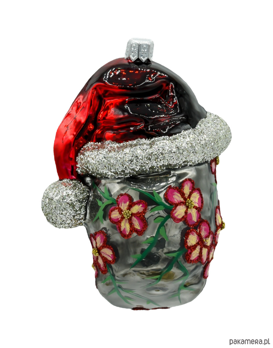 Unikalna bombka choinkowa w kształcie meksykańskiej czaszki (sugar skull) to świąteczna ozdoba, która łączy klimat Bożego Narodzenia z motywami z Día de los Muertos. Ręcznie malowana i bogato zdobiona, wyróżnia się intensywnymi kolorami – srebrzystą powierzchnią, jaskraworóżowymi ustami oraz kwiatowymi dekoracjami w odcieniach różu, czerwieni, żółci i zieleni. Czaszka nosi połyskującą czapkę świętego Mikołaja z czerwonym połyskiem i obwódką z grubego, srebrzystego brokatu, która nadaje całości szczyptę świątecznego humoru.