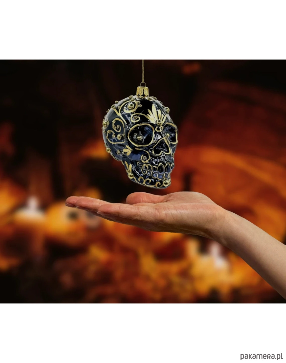 Design “Sugar Skull”: Złote ornamenty na czarnym tle tworzą unikalny wzór inspirowany tradycją meksykańskiego Dnia Zmarłych (Día de los Muertos). Wyrafinowane detale, takie jak złote akcenty wokół oczu, nosa i ust, podkreślają artystyczny charakter bombki.