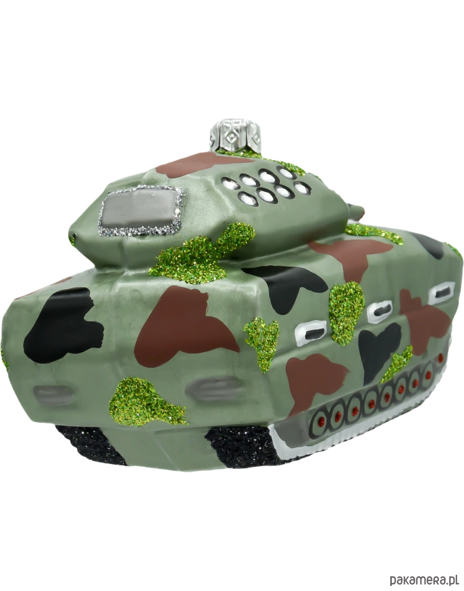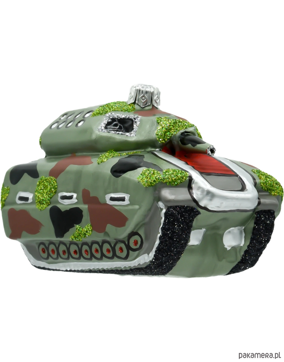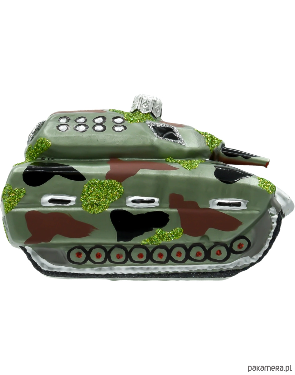 Szklana bombka choinkowa w kształcie czołgu to idealne połączenie tradycyjnego rzemiosła z nietypowym designem. Ręczne malowanie, realistyczne detale i brokatowe wykończenia sprawiają, że jest to wyjątkowa ozdoba świąteczna, która przyciągnie wzrok i wprowadzi odrobinę oryginalności do Twojego świątecznego wystroju. Dodaj ją do swojej kolekcji i ciesz się magią Świąt w niepowtarzalnym stylu!