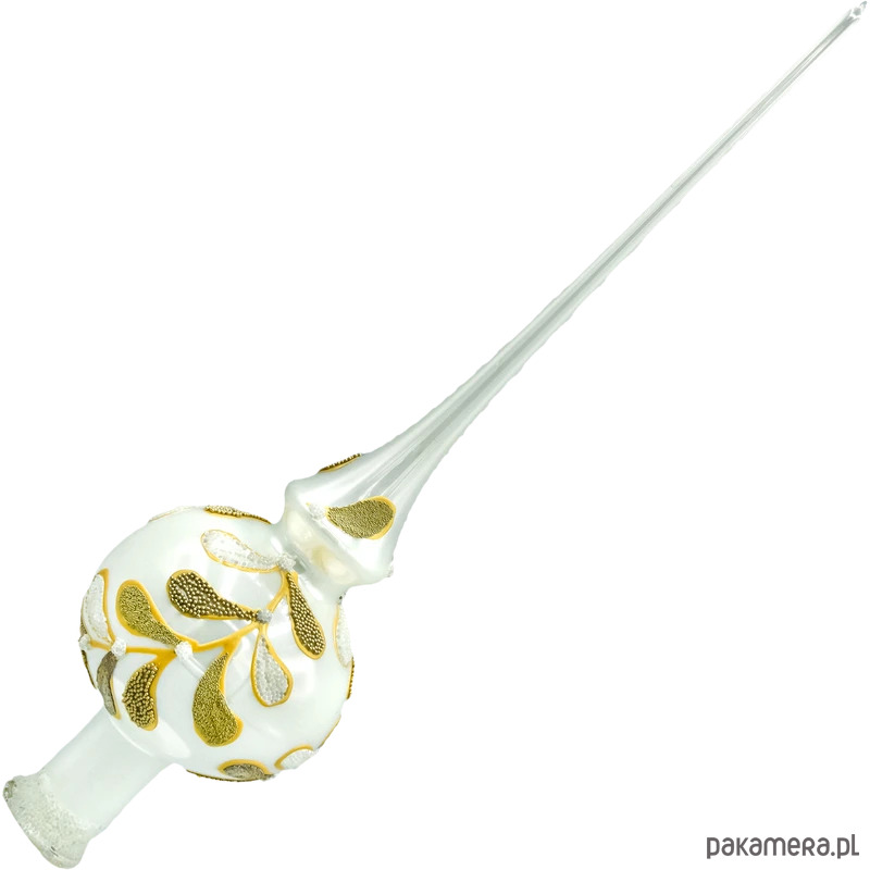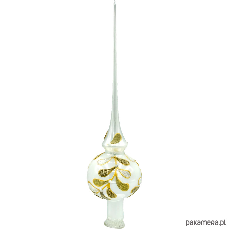 Wyjątkowy szpic / czub choinkowy inspirowany motywem jemioły. Ręcznie wydmuchany ze szkła i misternie malowany w polskiej pracowni łączy mlecznobiały dół z eleganckimi złotymi liśćmi oraz perłowymi jagodami. Smukła, krystalicznie przejrzysta iglica pięknie wysmukla drzewko, a dekorowana kula dodaje mu miękkiej, biżuteryjnej objętości. To idealny wybór do klasycznych i glamour aranżacji oraz do naturalnego, „skandynawskiego” wystroju.