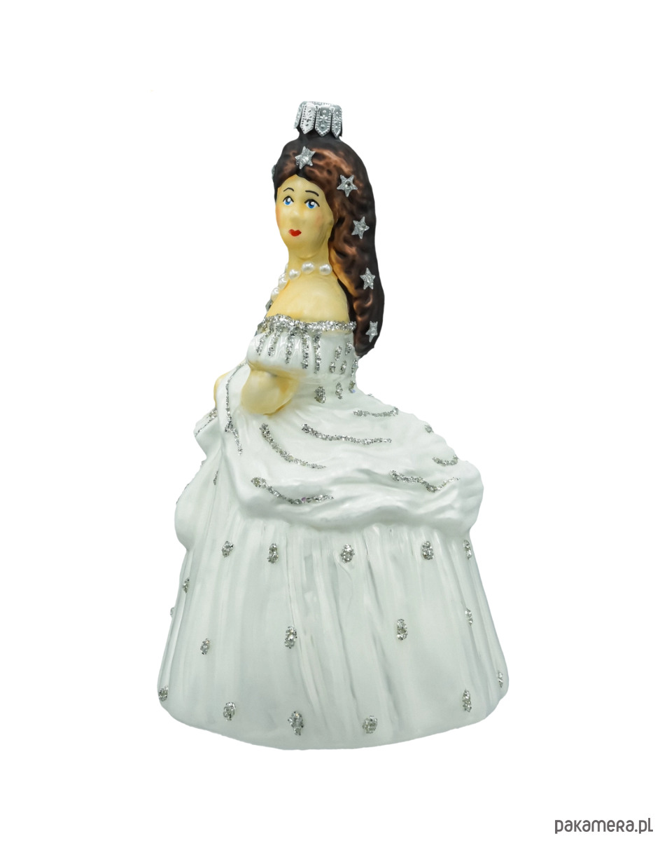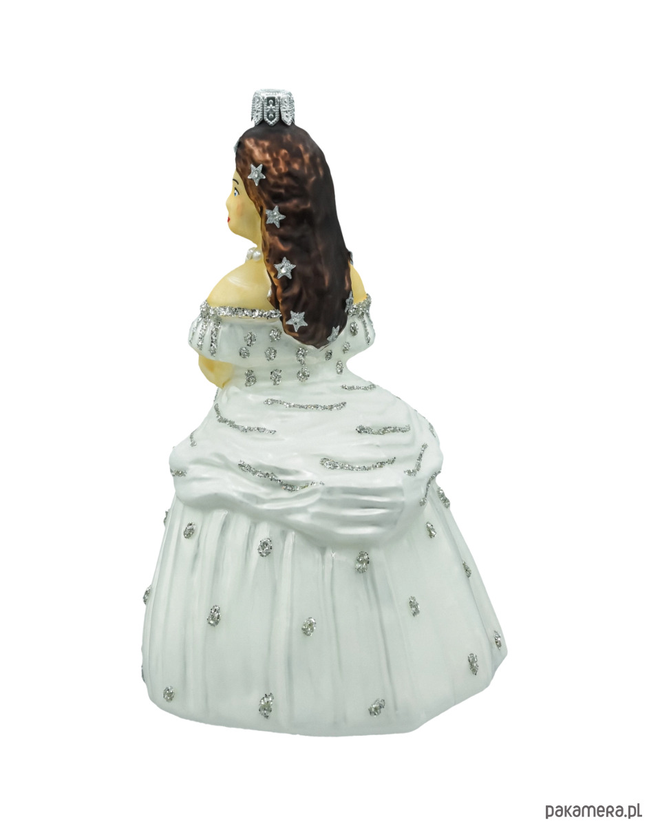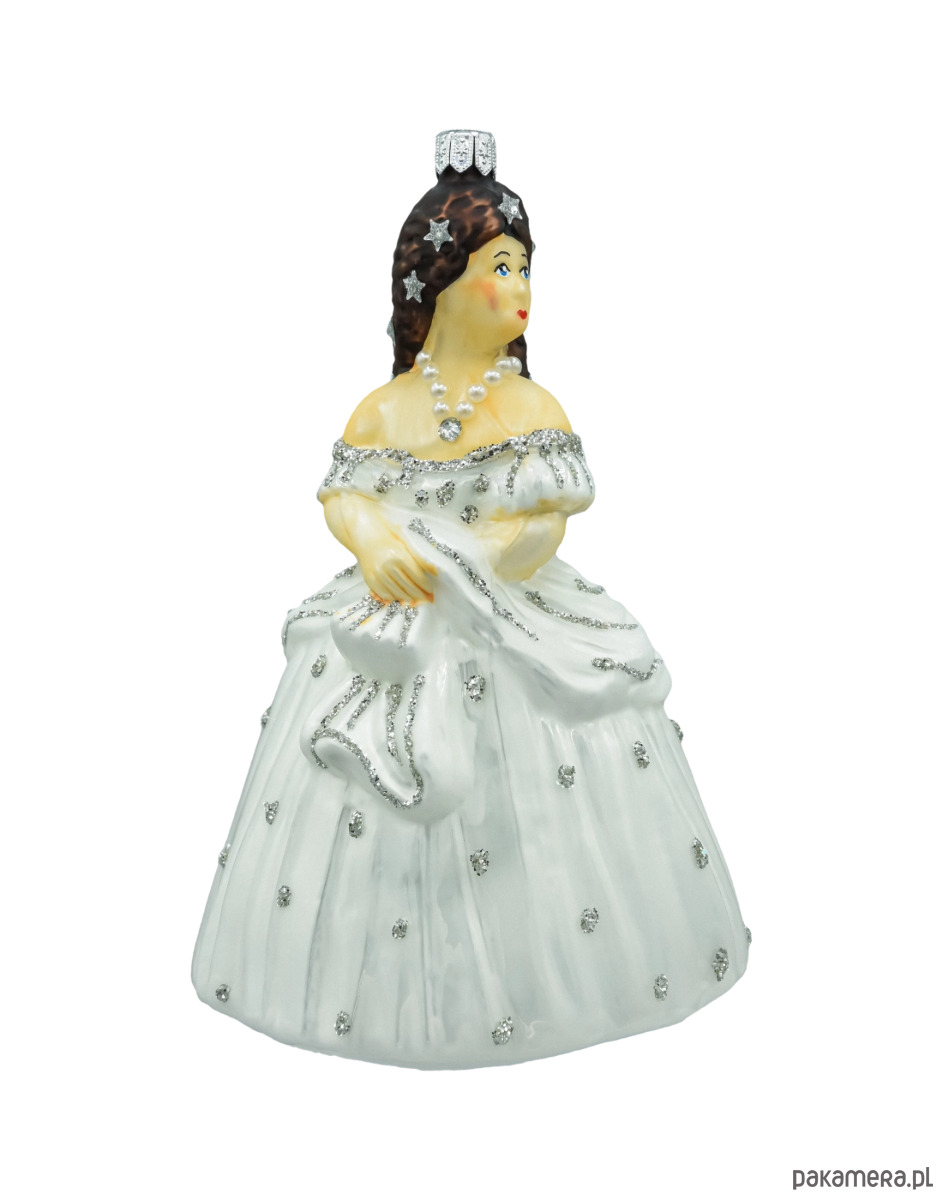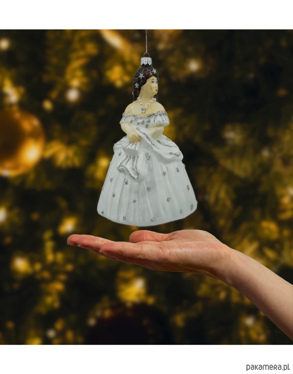 Elegancka bombka szklana – Księżniczka w białej sukni to figuralna ozdoba choinkowa, która wniesie na choinkę pałacowy blask i nutę bajkowej magii. Dmuchane szkło zostało ręcznie malowane i bogato zdobione srebrnym brokatem: na obszernej, wielowarstwowej sukni połyskują drobne iskry, a we włosach królują gwiazdki niczym biżuteria. Subtelny makijaż, naszyjnik z perełek oraz finezyjny, odkryty dekolt nadają postaci szlachetności i czynią z niej wyjątkowy, kolekcjonerski element dekoracji. To idealny wybór do aranżacji glamour, klasycznych i vintage, a także piękny prezent świąteczny dla miłośniczek baśni i eleganckich dodatków.
