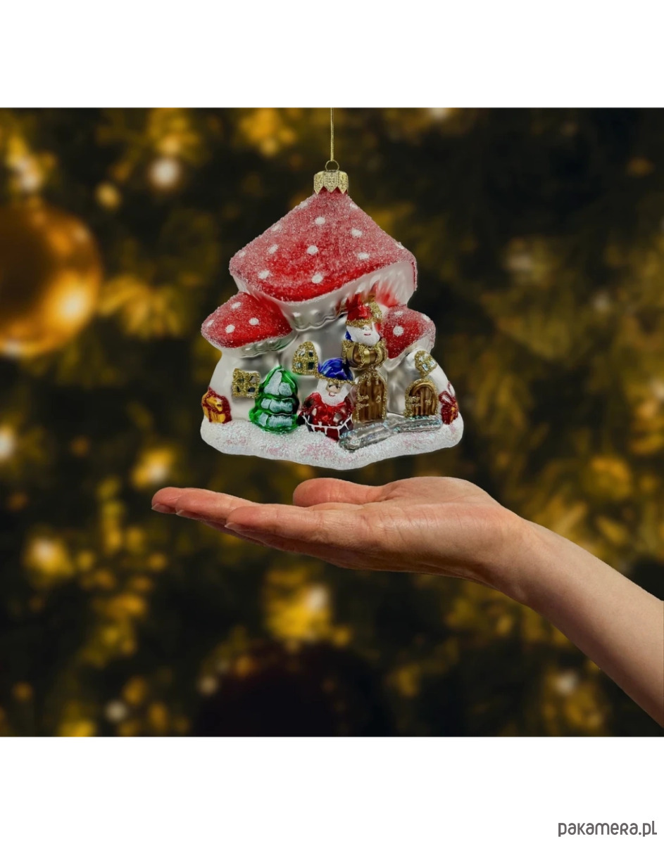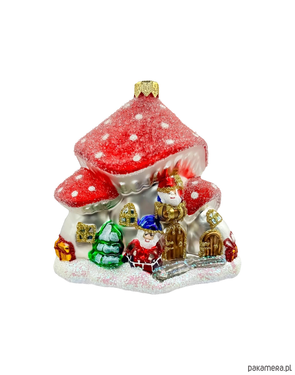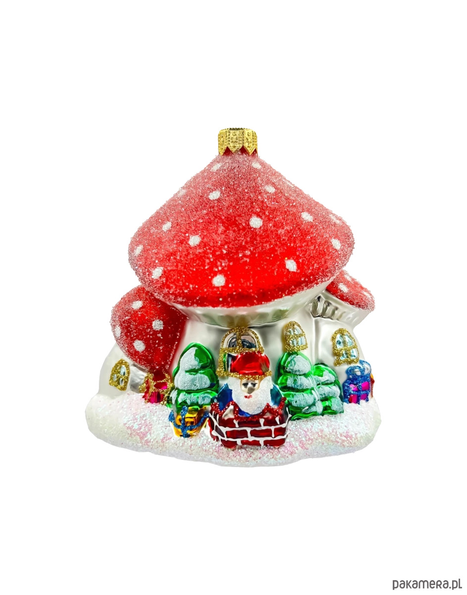 Bombka przedstawia bajkowy domek w kształcie grzyba z czerwonym, brokatowym dachem, który wygląda jak pokryty śniegiem. Przed domkiem znajduje się radosny Mikołaj w czerwonym stroju, otoczony kolorowymi prezentami oraz zielonymi, ośnieżonymi choinkami.