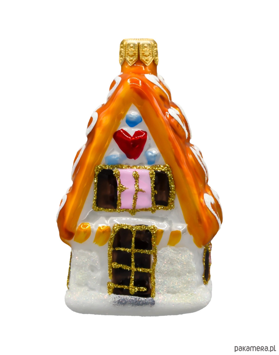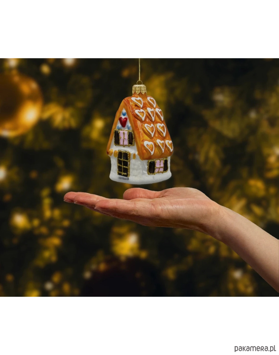 Każdy element bombki został wykonany z dbałością o detale – od okienek obramowanych złotym brokatem, po śnieżne zaspki przy drzwiach. Lekko połyskująca powierzchnia szkła odbija światło choinkowych lampek, tworząc ciepłą, przytulną atmosferę. Bombka ma solidne złote oczko do zawieszenia, które pasuje do każdego haczyka lub sznureczka ozdobnego. Idealna dla miłośników klasycznych, bajkowych dekoracji, fanów rękodzieła oraz jako prezent pod choinkę.