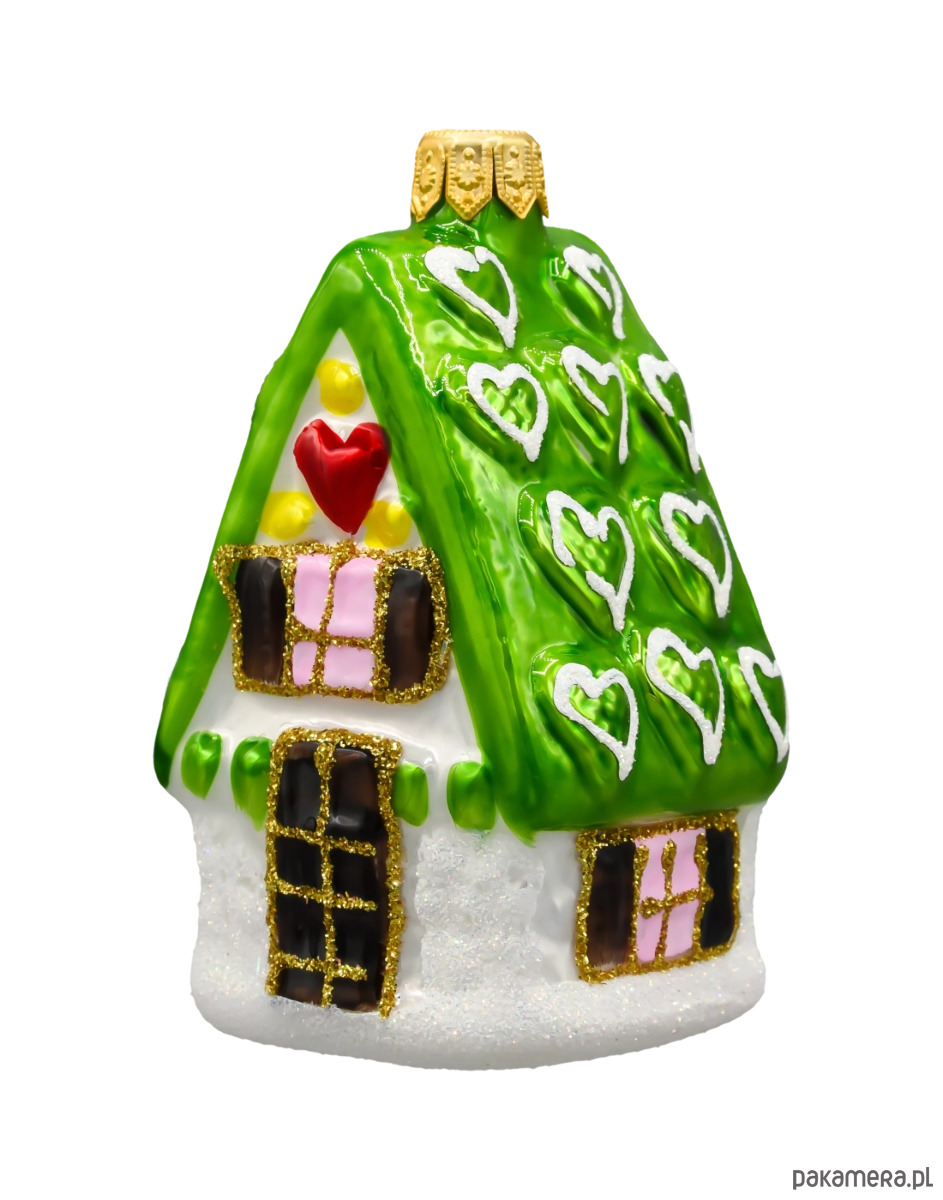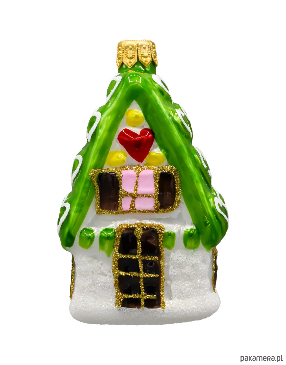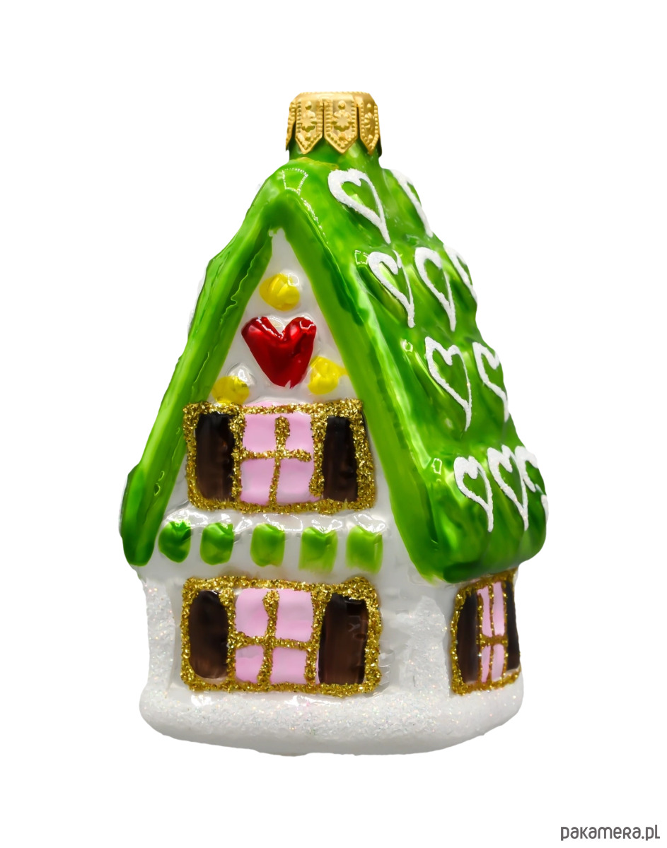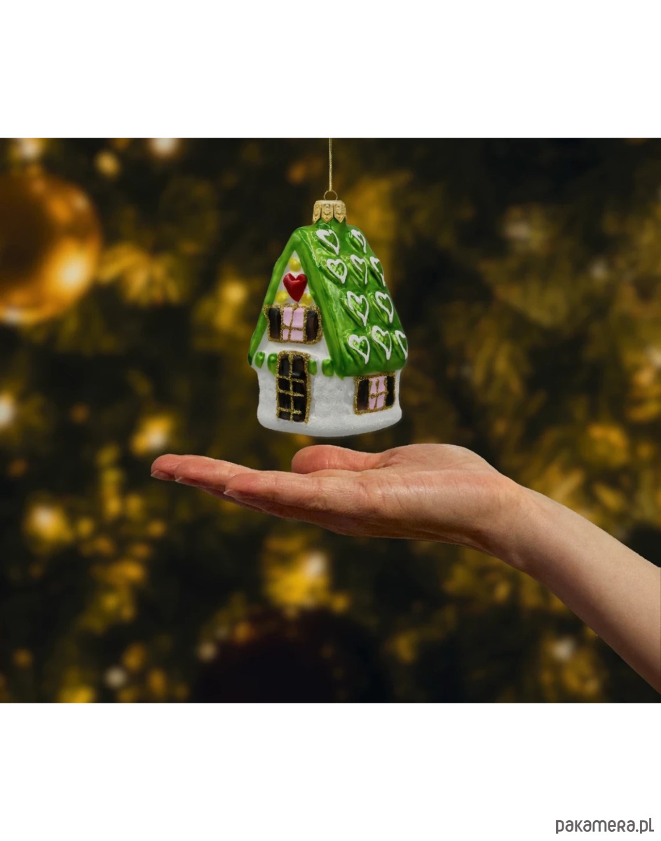 Wprowadź do swojego domu czar świąt dzięki niezwykłej bombce choinkowej w kształcie domku z zielonym dachem! Ta urocza, ręcznie malowana ozdoba wykonana została ze szkła najwyższej jakości, a każdy jej detal zachwyca precyzją i dbałością o świąteczny klimat. Zielony dach pokryty jest wypukłymi białymi serduszkami, przypominającymi lukrowe dekoracje rodem z bajkowej chatki z piernika. Na froncie domku znajdziemy czerwone serce, pastelowe okienka z różowymi szybkami oraz żółte i zielone zdobienia, które nadają całości słodkiego, cukierkowego charakteru.