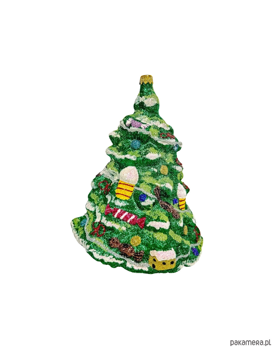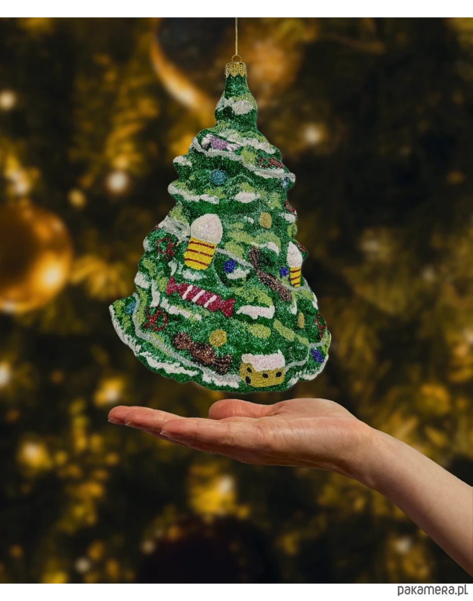 Bombka „Zielona choinka z ozdobami” została stworzona przez doświadczonych rzemieślników, którzy z niezwykłą precyzją oddali każdy szczegół tej ozdoby. Brokatowe akcenty na powierzchni choinki tworzą efekt śnieżnej pokrywy, która otula ozdoby i gałązki, a różnokolorowe elementy, takie jak cukierki, bombki i wstążki, dodają bombce świątecznego charakteru. Kolorowe detale są starannie naniesione, co podkreśla rękodzielniczy charakter tej ozdoby. Bombka ta jest nie tylko pięknym elementem dekoracyjnym, ale także odzwierciedleniem tradycji i świątecznej radości.