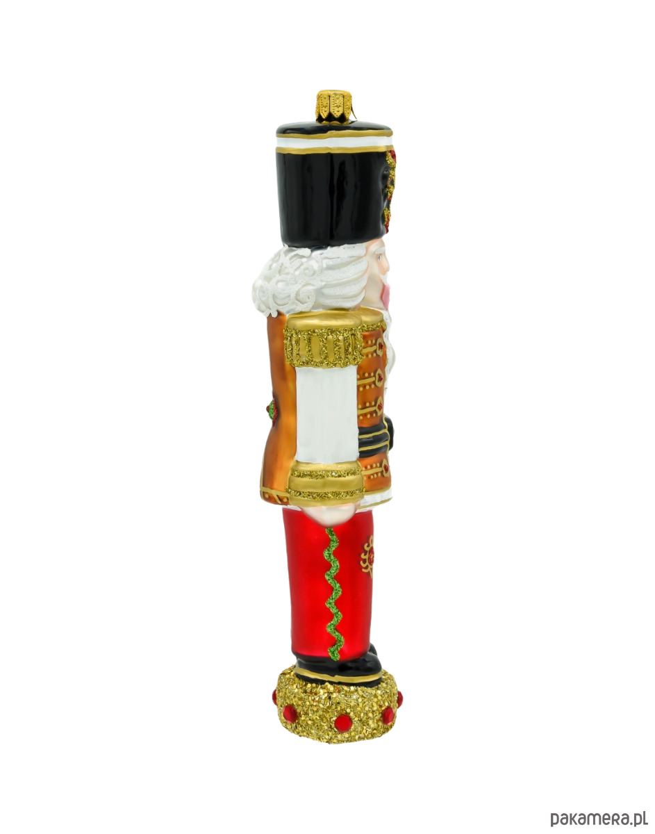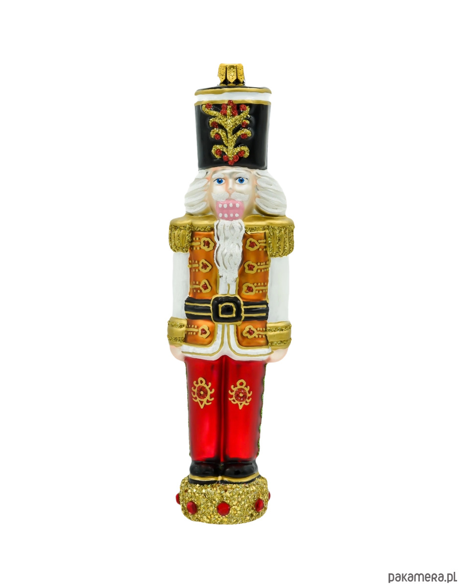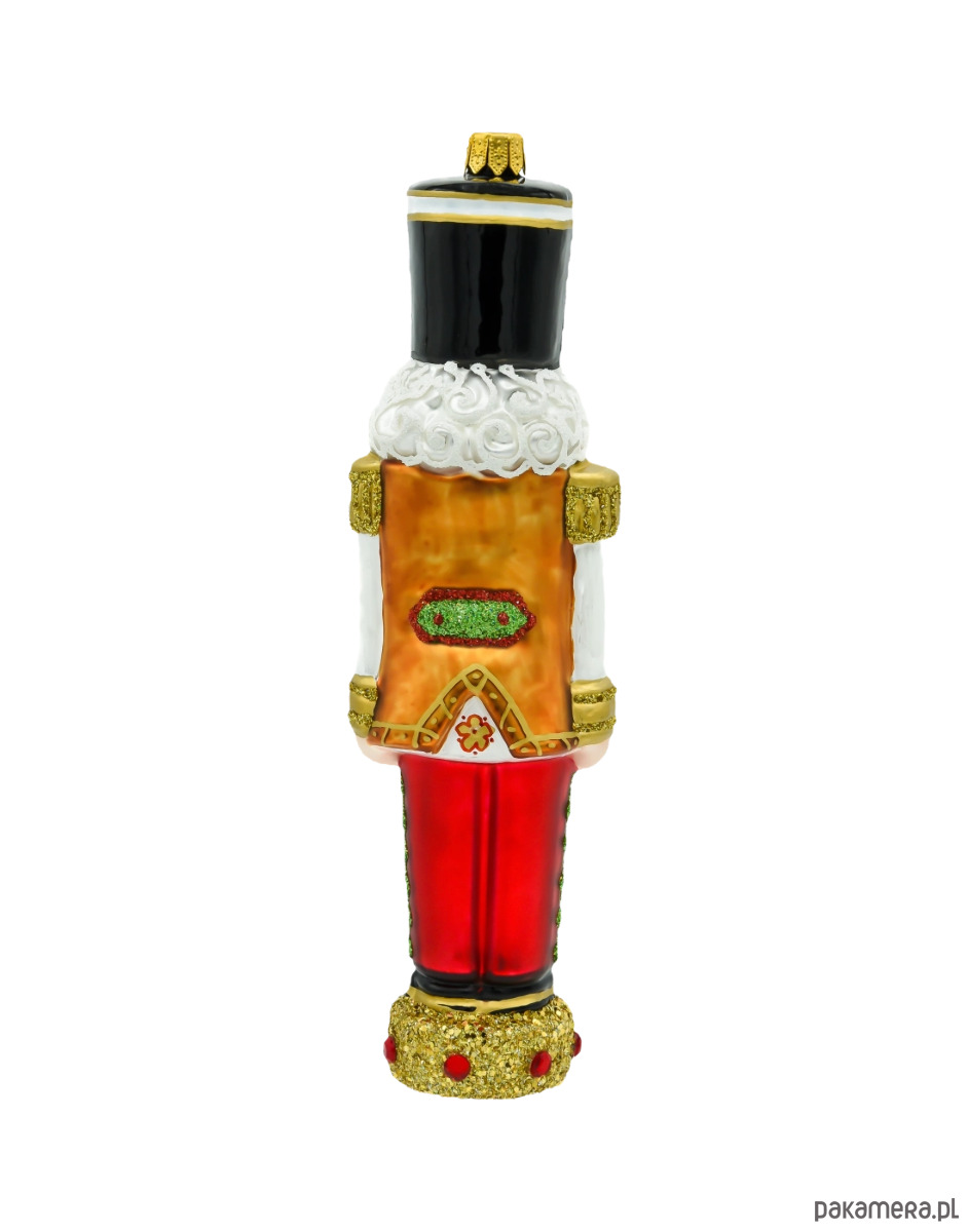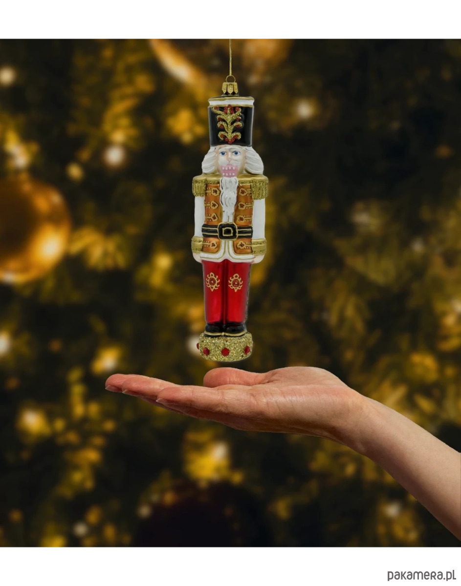 Bombka “Dziadek do Orzechów” to ikoniczna ozdoba świąteczna inspirowana klasycznym baletem i tradycyjnymi dekoracjami bożonarodzeniowymi. Wykonana z najwyższej jakości szkła i ręcznie malowana, zachwyca precyzją detali oraz bogatą kolorystyką. Wizerunek dumnego dziadka do orzechów, ubrany w złoto-czerwony mundur z czarną czapką i zdobieniami, wprowadza do wnętrza atmosferę magii i tradycji.