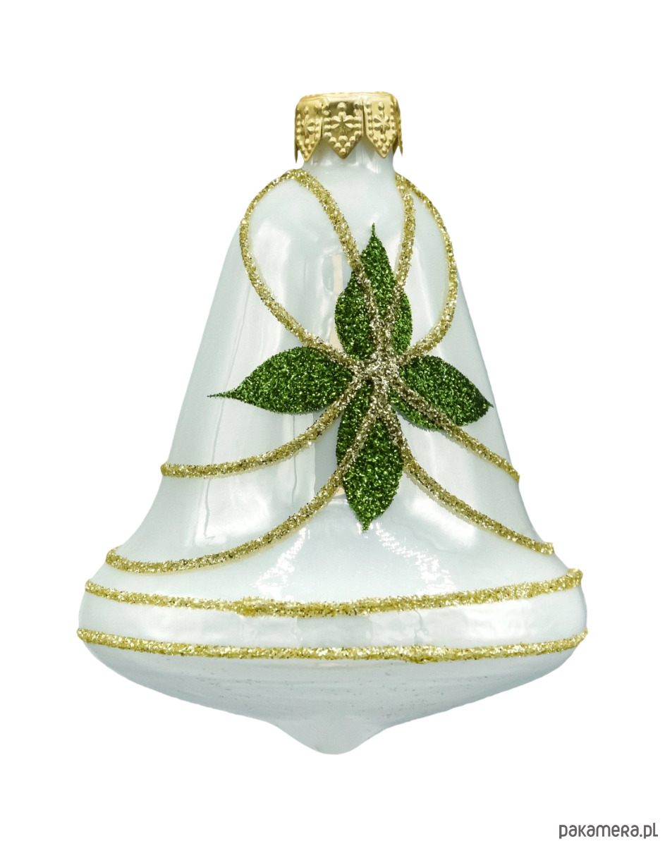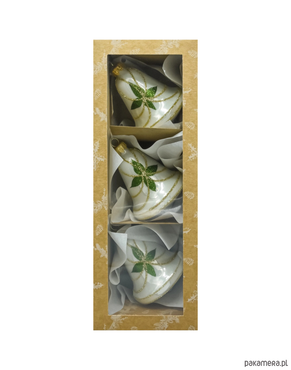 Eleganckie, ręcznie zdobione dzwonki ze szkła to klasyka świątecznego wystroju. Każda bombka ma perłowo-białą bazę, złote, brokatowe linie oraz dekor z zielonych listków ułożonych w gwiazdę. Subtelny połysk i precyzyjne wykończenie sprawiają, że dzwonki pięknie odbijają światło lampek, dodając choince blasku i szlachetnego charakteru. Komplet zapakowano w ozdobne pudełko z okienkiem – gotowe do podarowania jako prezent.
