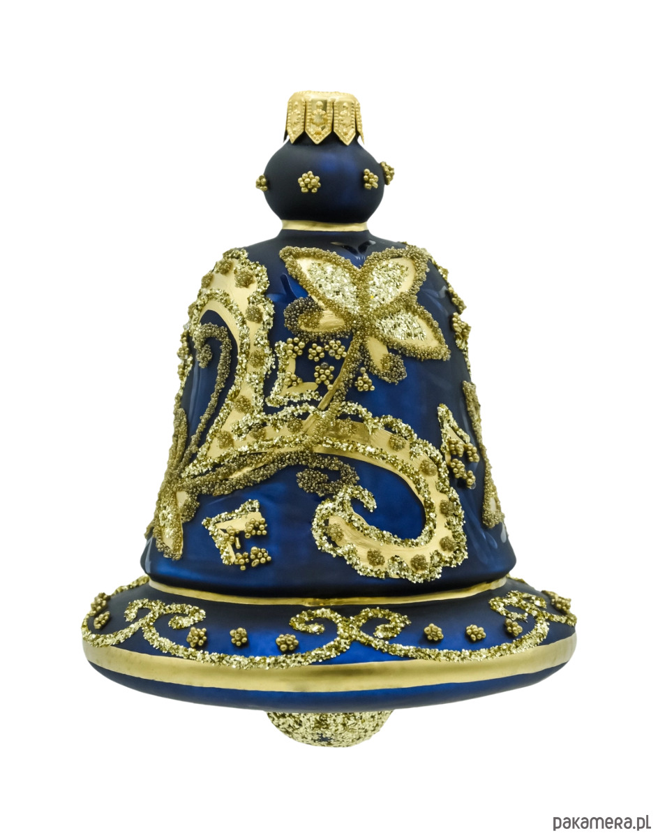 Bombka choinkowa: Dzwonek ze złotym ornamentem: granatowy