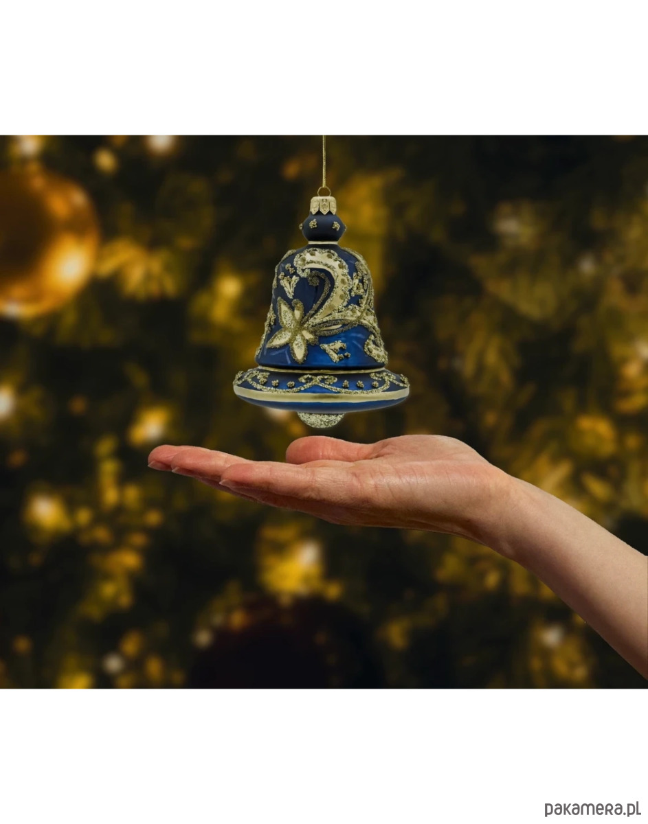 Granatowo-złota bombka szklana – dzwonek to elegancka ozdoba choinkowa, która łączy klasyczne rzemiosło ze stylowym, pałacowym wzornictwem. Głęboki, matowy granat stanowi tło dla misternych, wypukłych ornamentów w kolorze szlachetnego złota. Kwiatowe motywy, barokowe zawijasy i drobne kuleczki brokatowe tworzą efekt biżuteryjnej faktury – bombka mieni się i pięknie łapie światło lampek choinkowych, dodając choince luksusowego charakteru.