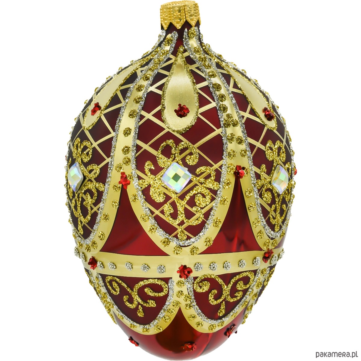 Czerwona, błyszcząca powierzchnia bombki pokryta jest misternymi, ręcznie wykonanymi złotymi ornamentami, które tworzą elegancki wzór siatki. Dodatkowo bombka ozdobiona została brokatem oraz kryształkami w kolorze tęczowym i czerwonym, które nadają jej efektownego blasku.