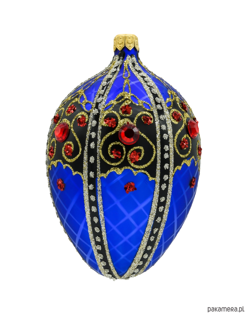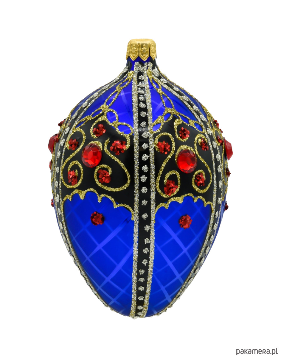 Szklane jajo Fabergé – kobaltowe z czerwonymi kryształkami i złoto-srebrnym zdobieniem