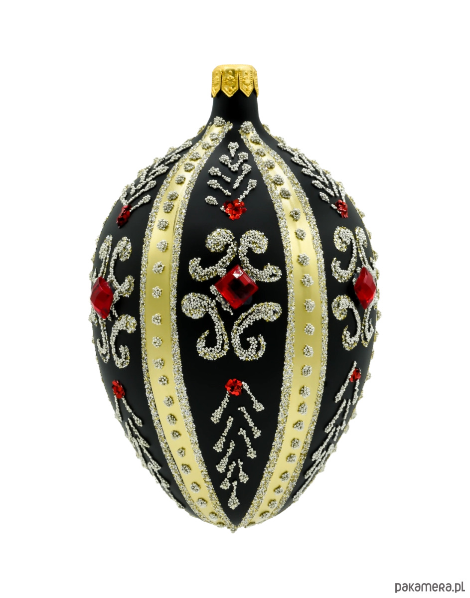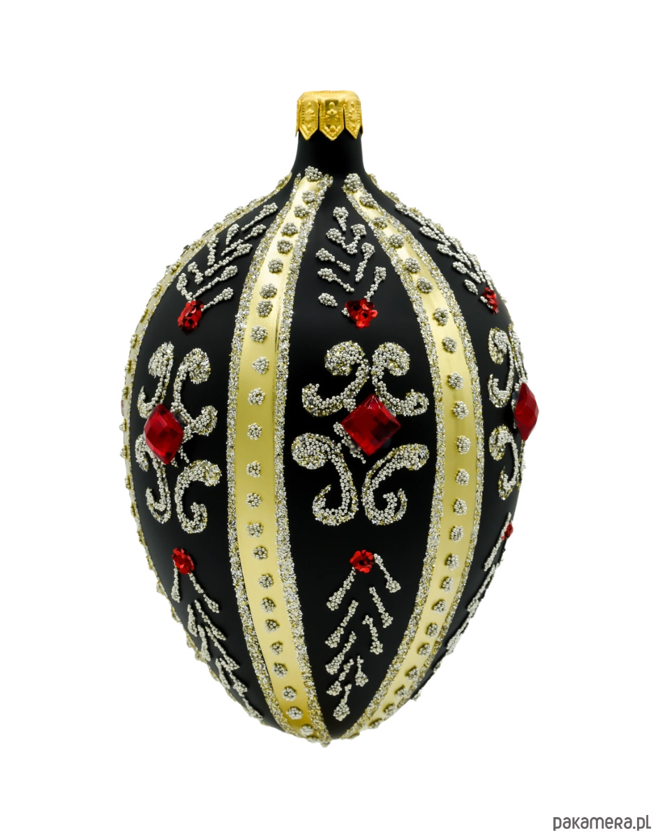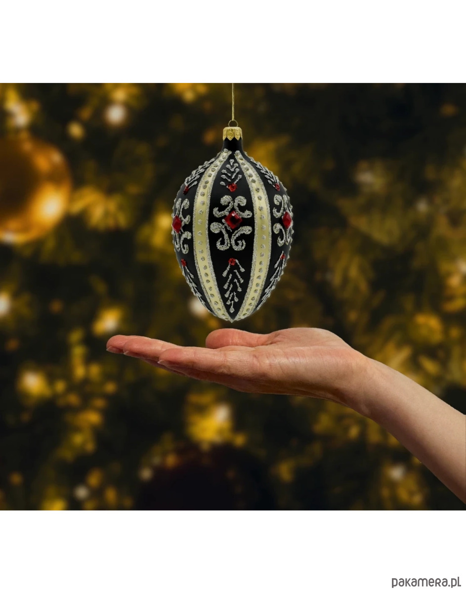 Wprowadź do swojej świątecznej kolekcji odrobinę carskiego splendoru dzięki tej wyjątkowej bombce w kształcie jaja Fabergé. Wykonane ze szkła i ręcznie zdobione z niezwykłą precyzją, czarne szklane jajo zachwyca elegancją i dbałością o detale. Jego matowa, głęboka czerń stanowi doskonałe tło dla złotych pasów, bogatych ornamentów oraz finezyjnych wzorów ułożonych z mikroszklanych koralików i srebrzystego brokatu. Całość dopełniają rubinowoczerwone kryształki, które przyciągają wzrok i subtelnie odbijają światło choinkowych lampek.