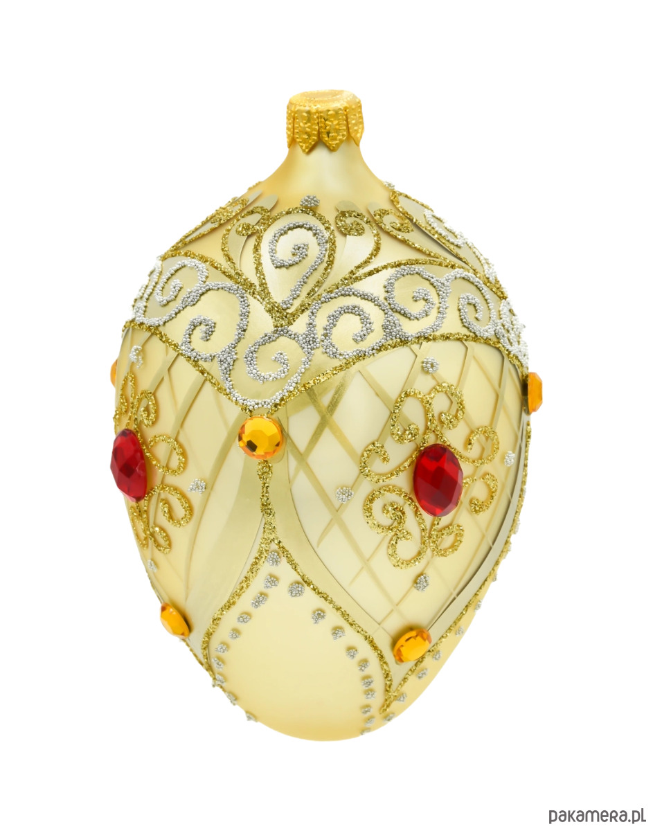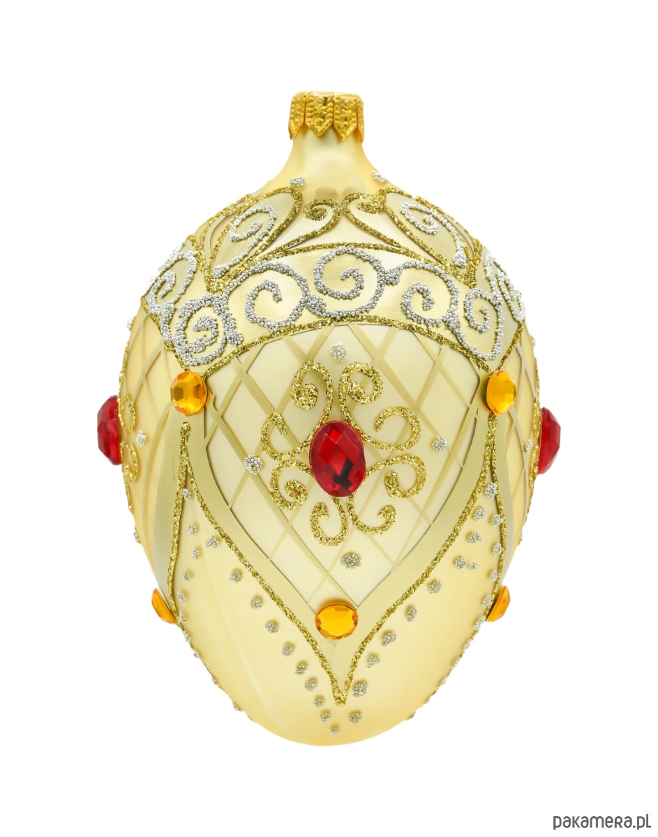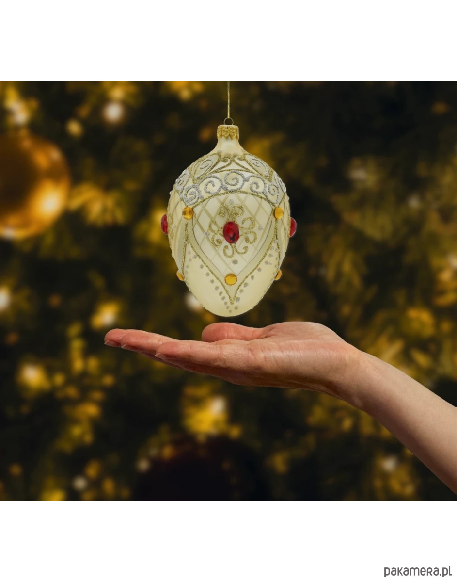 To ekskluzywne szklane jajo Fabergé to kwintesencja świątecznej elegancji i luksusu. Wykonane z najwyższej jakości szkła, urzeka subtelnym, satynowym złotem oraz misternym zdobieniem, które przywodzi na myśl królewskie klejnoty. Delikatna, kratkowana faktura powierzchni ozdobiona została bogatym ornamentem z drobnego, złotego i srebrnego brokatu, tworząc finezyjne esy-floresy o klasycznym, pałacowym charakterze.