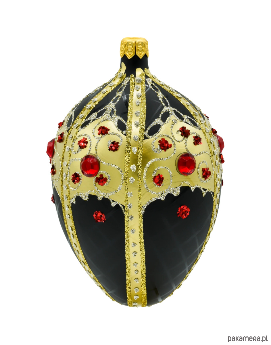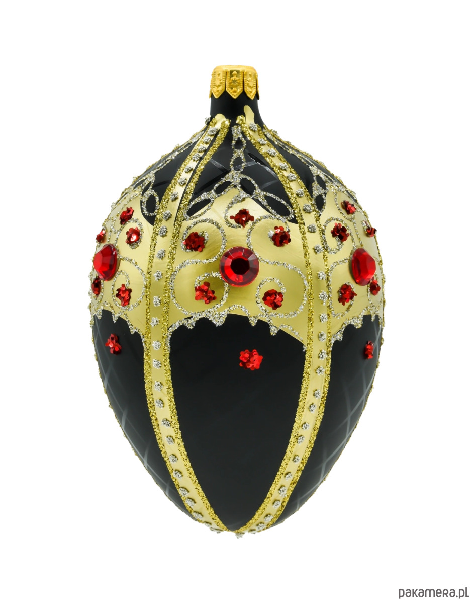 Szklane jajo Fabergé – czarne szkło z bogatym złotym ornamentem i czerwonymi kryształkami