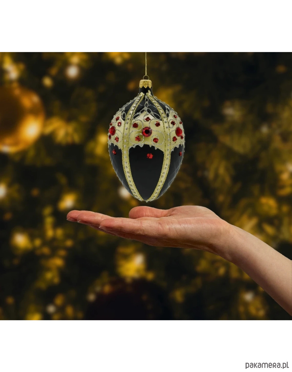 Główną ozdobą bombki są intensywnie czerwone kryształki – zarówno płaskie, jak i wypukłe, które efektownie odbijają światło, tworząc zjawiskowy kontrast z czarnym tłem. Ornamentowe pasy dzielą jajo na segmenty, tworząc harmonijną kompozycję i podkreślając jego formę inspirowaną historycznymi jajami Fabergé. To wyjątkowa dekoracja, która nada każdemu wnętrzu arystokratycznego sznytu.