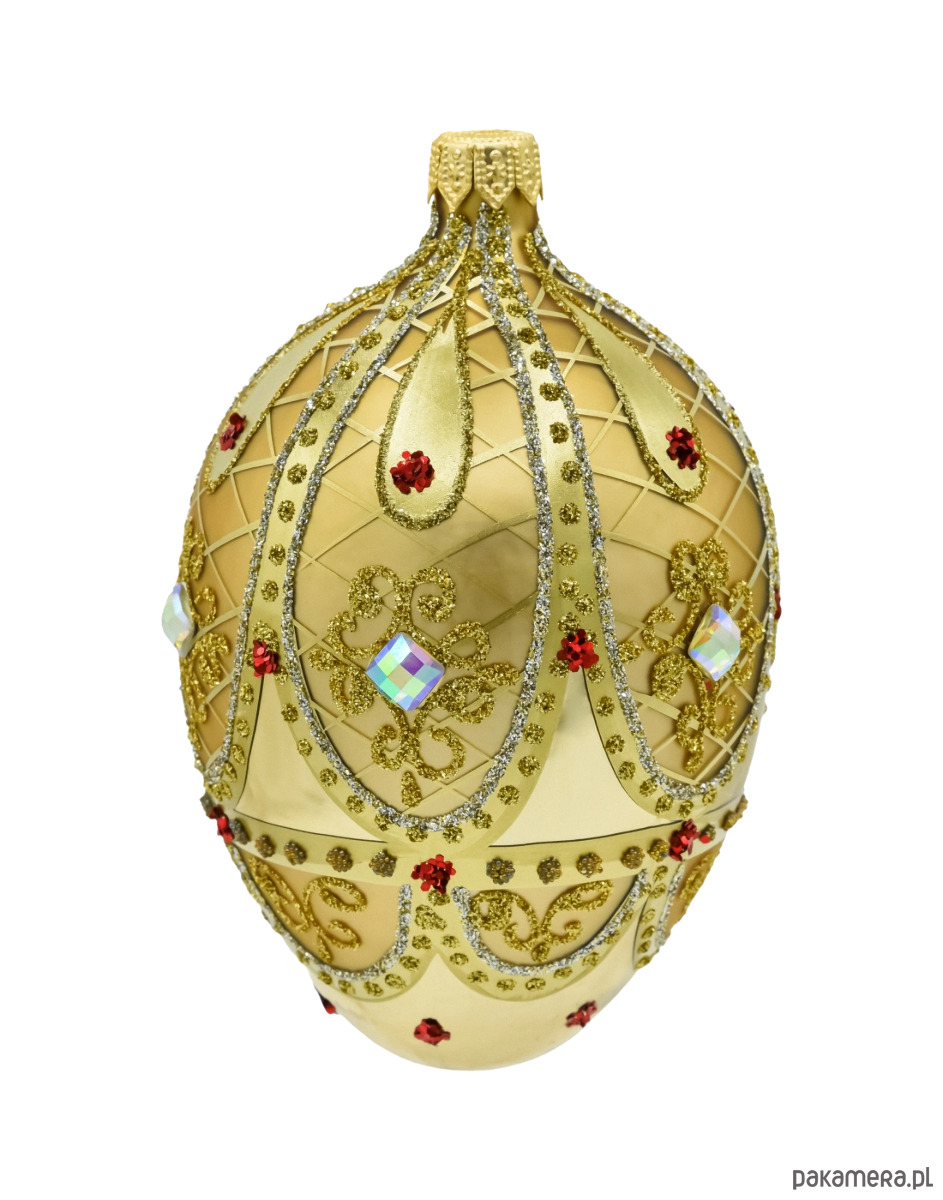 Na złotym tle bombki widoczne są delikatne ornamenty z brokatem, które tworzą piękne, symetryczne wzory przypominające misterną koronkę. Bombka zdobiona jest również lśniącymi kryształkami w odcieniach czerwieni i opalizującego błękitu, które pięknie odbijają światło, dodając całości blasku i głębi. Geometryczne linie w połączeniu z falistymi motywami tworzą elegancką kompozycję, która przywołuje na myśl klasyczne jaja Faberge.