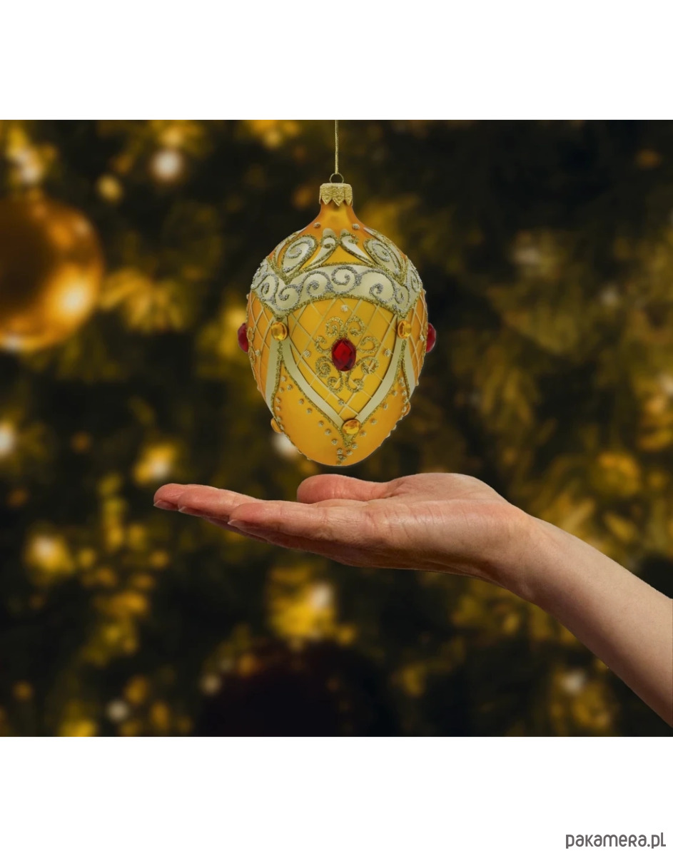 Ta bombka Faberge idealnie pasuje do dekoracji w stylu glamour, vintage, oraz klasycznym, wnosząc do wnętrza wyrafinowaną elegancję i ciepło.