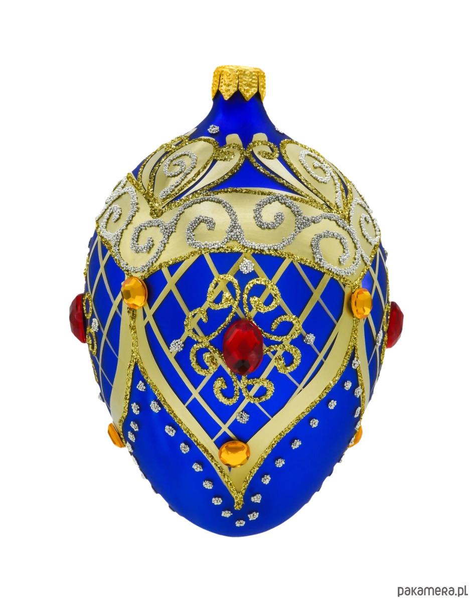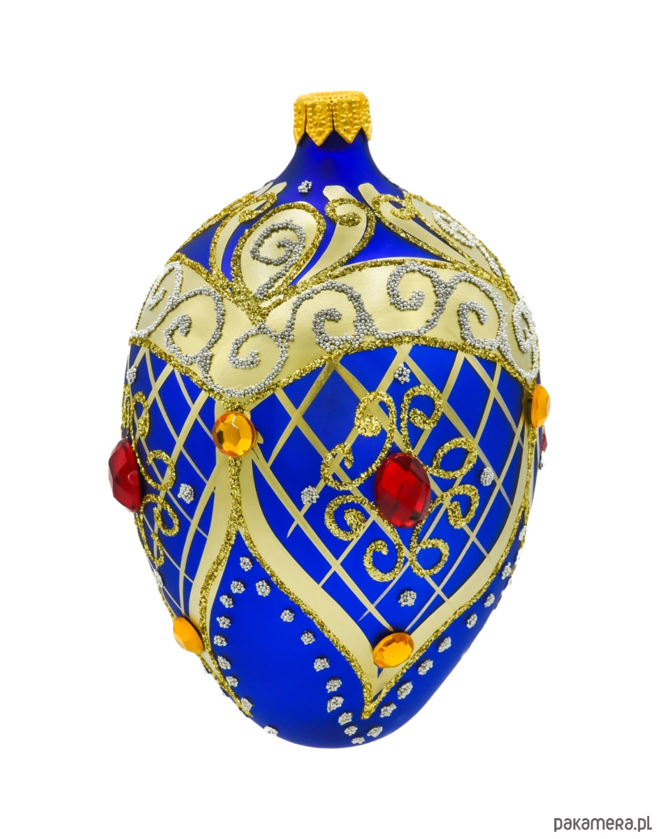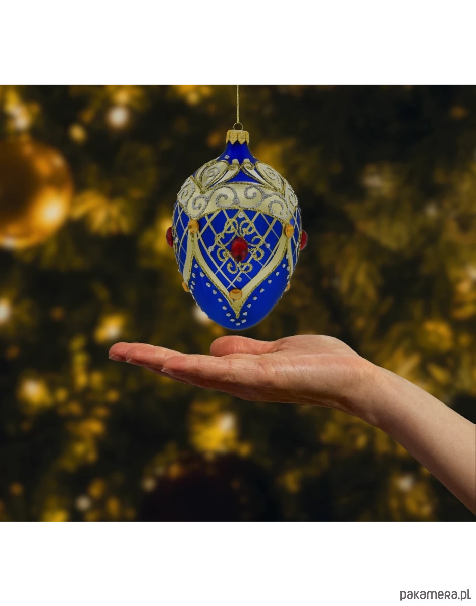 Bombka nawiązuje do stylu legendarnych jaj Fabergé, znanych z przepychu i kunsztownego wykonania. Połączenie głębokiego błękitu i złota nadaje jej wyjątkowego charakteru.