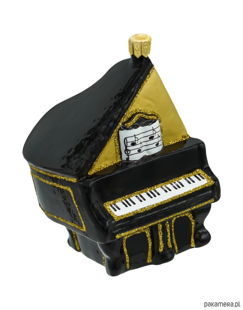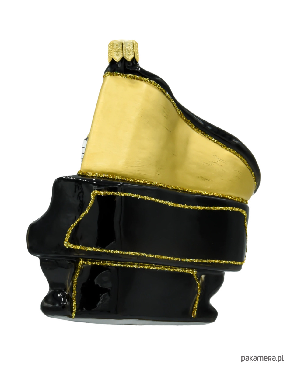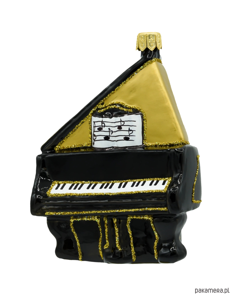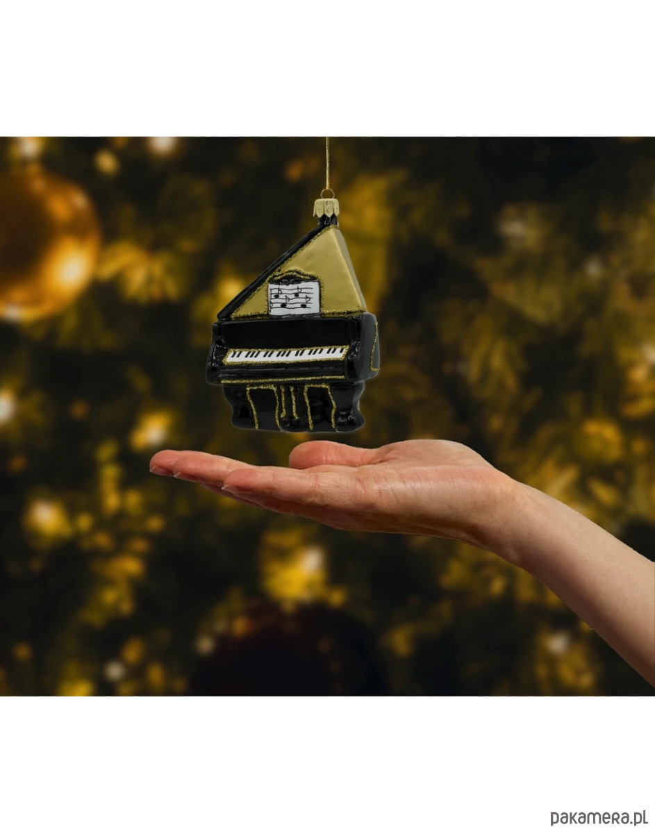 Bombka „Fortepian” została stworzona z dbałością o najmniejsze szczegóły, aby w pełni oddać piękno i majestatyczność tego wyjątkowego instrumentu. Ręcznie malowane czarno-złote wykończenie dodaje elegancji i blasku, a misternie odwzorowana klawiatura oraz realistyczne nuty na pulpicie sprawiają, że bombka wygląda niezwykle autentycznie. Jest to prawdziwe dzieło sztuki, które z powodzeniem może stać się centralnym elementem każdej świątecznej dekoracji.
