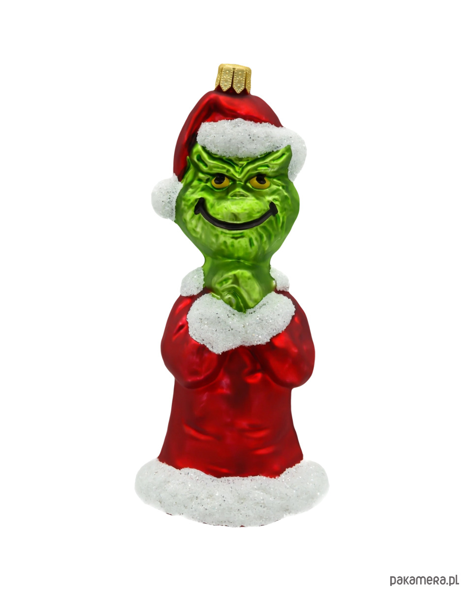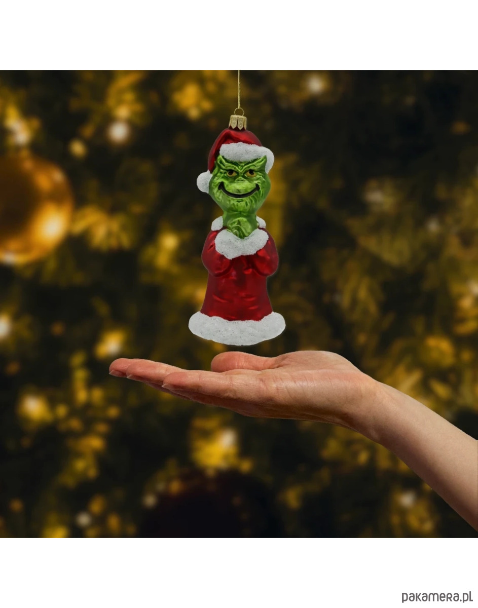 Ta ręcznie malowana bombka choinkowa przedstawia kultowego Grincha w jego typowym, lekko zawadiackim wydaniu – z chytrym uśmiechem, złożonymi rękami i ubraniem rodem z mikołajowego stroju. Grinch ma intensywnie zieloną twarz z połyskującym wykończeniem, czerwony płaszcz z białymi, brokatowymi obszyciami oraz czapkę świąteczną z pomponem. Całość wykonana została z dmuchanego szkła i pokryta ręcznie nakładanymi detalami z brokatu, co czyni każdą sztukę unikatową.