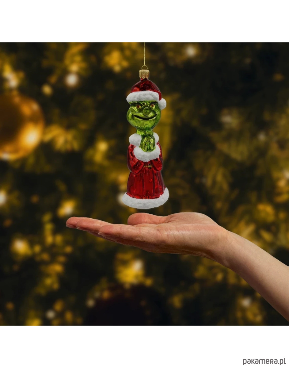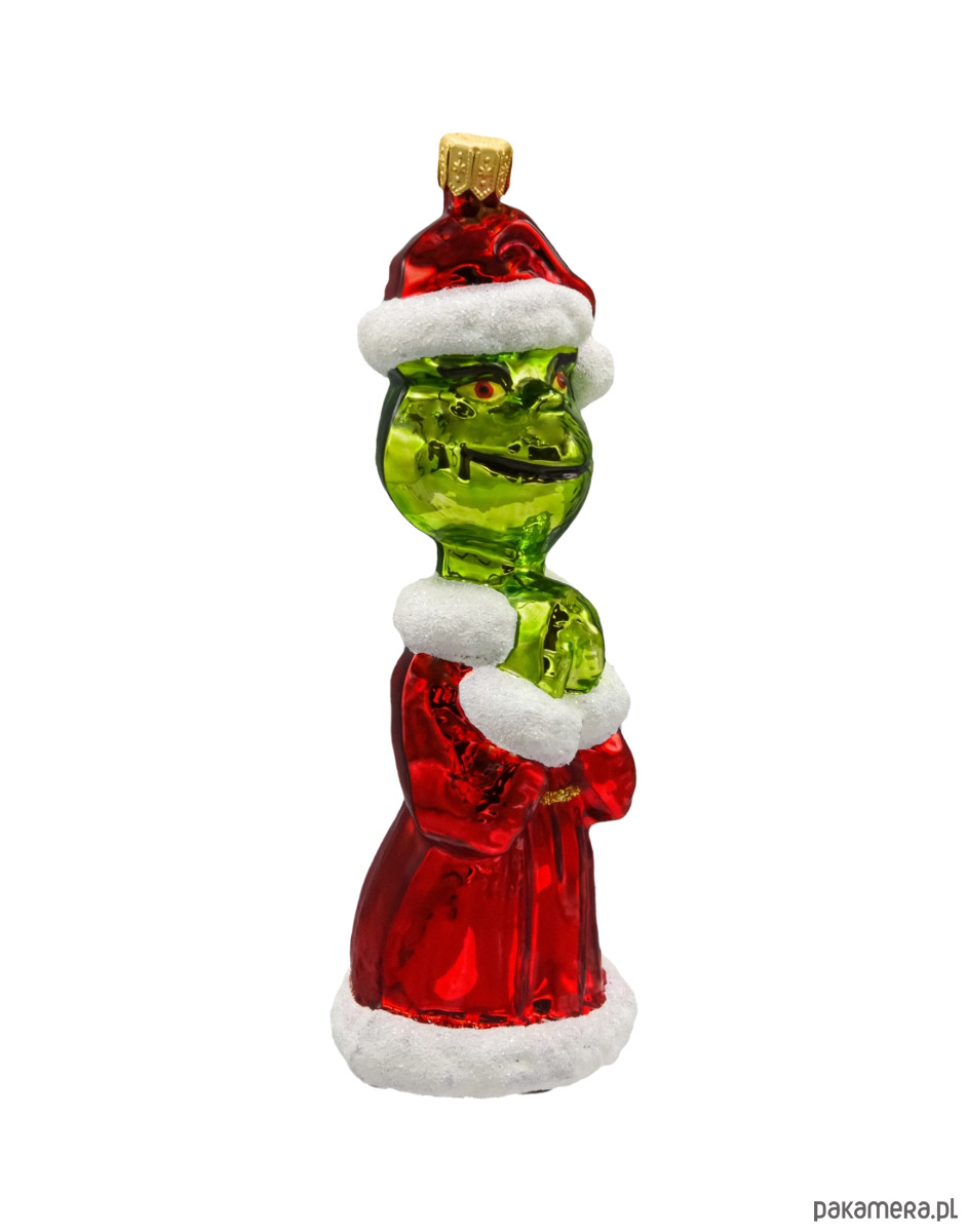 Szklana bombka choinkowa „Grinch w płaszczu” to niezwykle wyrazista ozdoba świąteczna, która przyciąga uwagę nie tylko intensywną kolorystyką, ale także doskonale oddanym charakterem tej ikonicznej postaci. Bombka przedstawia zielonego Grincha w błyszczącym, czerwonym płaszczu z brokatowymi obszyciami – dokładnie takiego, jakiego znamy z klasycznej opowieści o świętach. Złośliwy uśmiech, czerwone oczy i splecione dłonie dodają figurce wyrazu i odrobiny humoru, który idealnie wpisuje się w klimat świątecznego absurdu.
