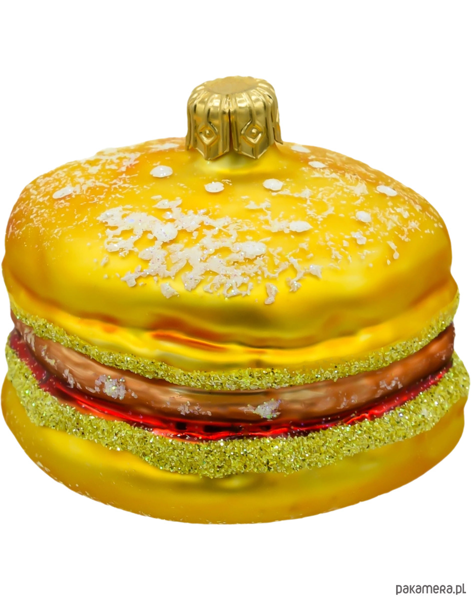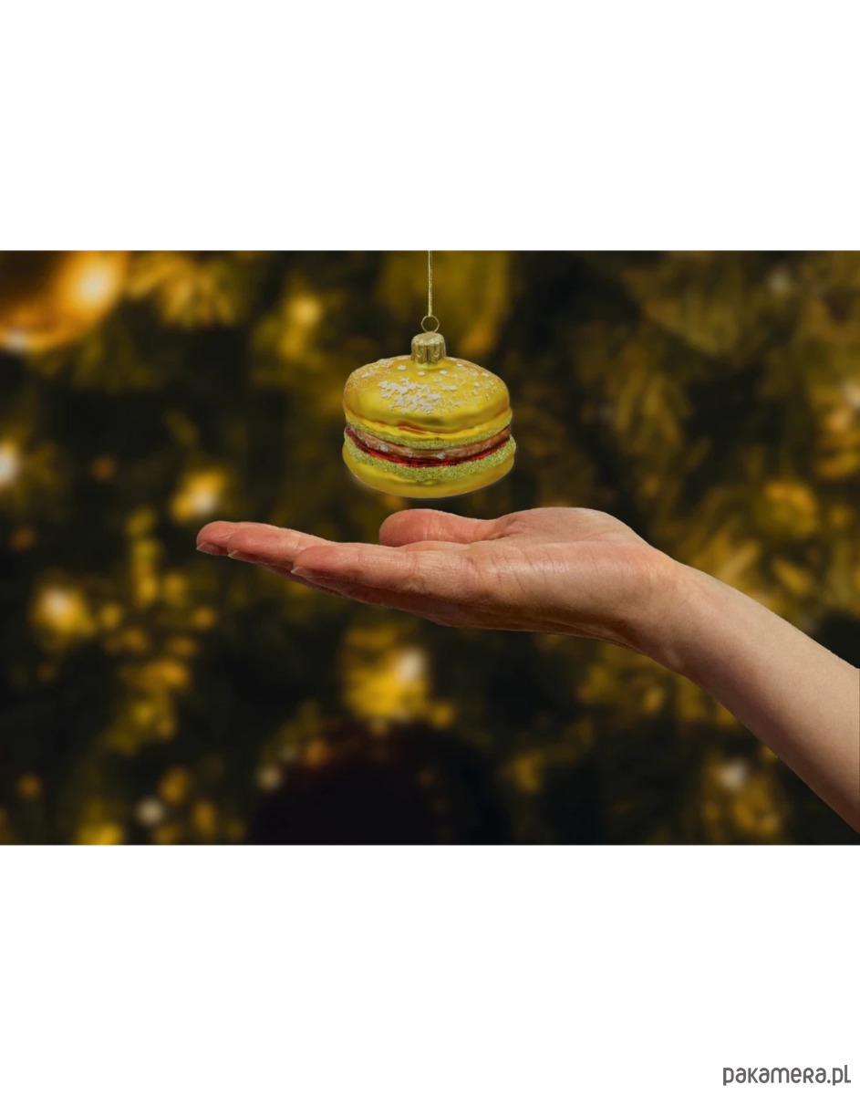Ręcznie wykonana ze szkła dmuchanego, bombka zachwyca bogactwem kolorów i detali: soczysta bułka w odcieniu złocistego brązu posypana „sezamem”, a w środku warstwy przypominające mięso, warzywa i sos, podkreślone błyszczącym brokatem. Całość została wykończona z dbałością o każdy szczegół, co nadaje bombce niepowtarzalny, realistyczny wygląd.