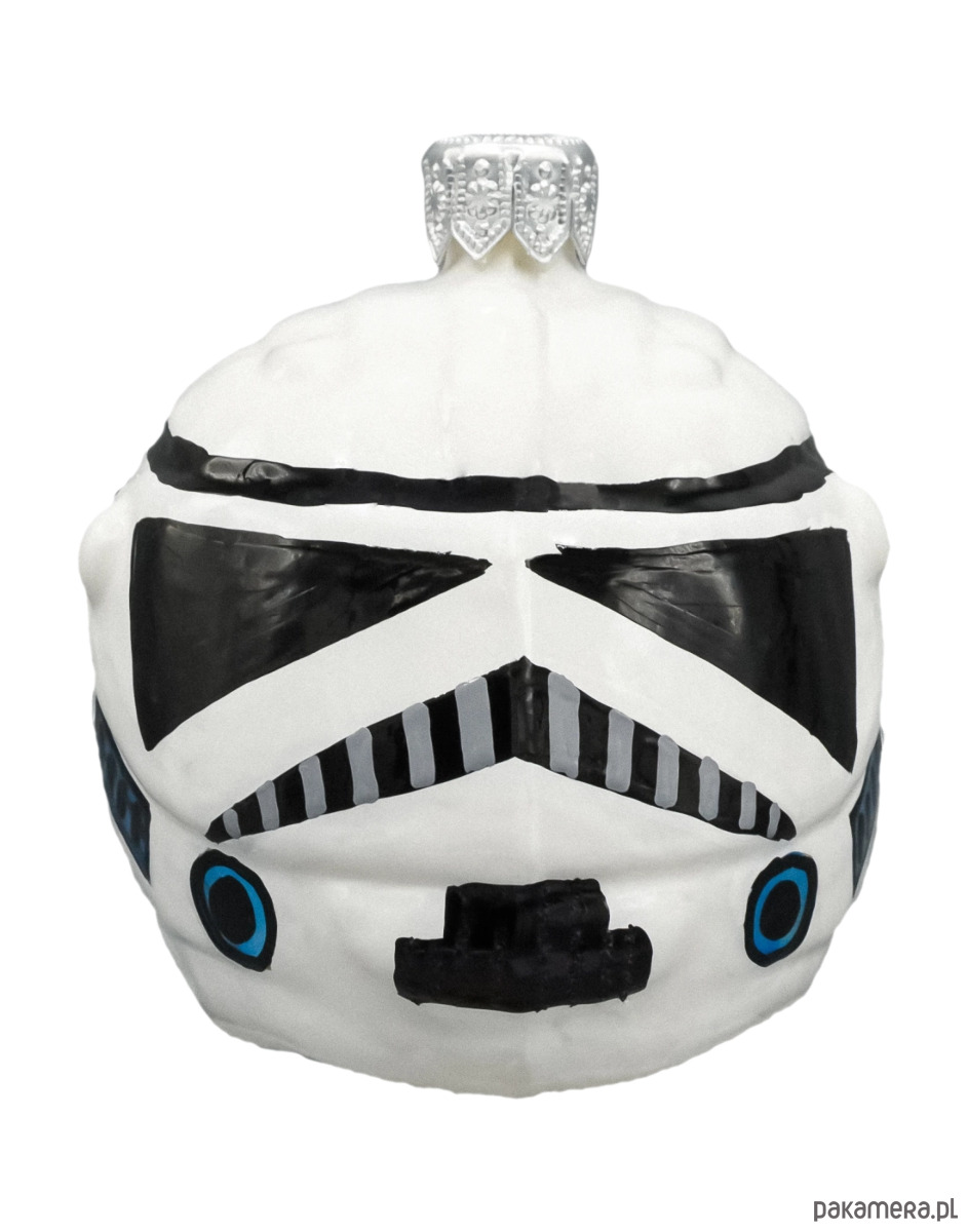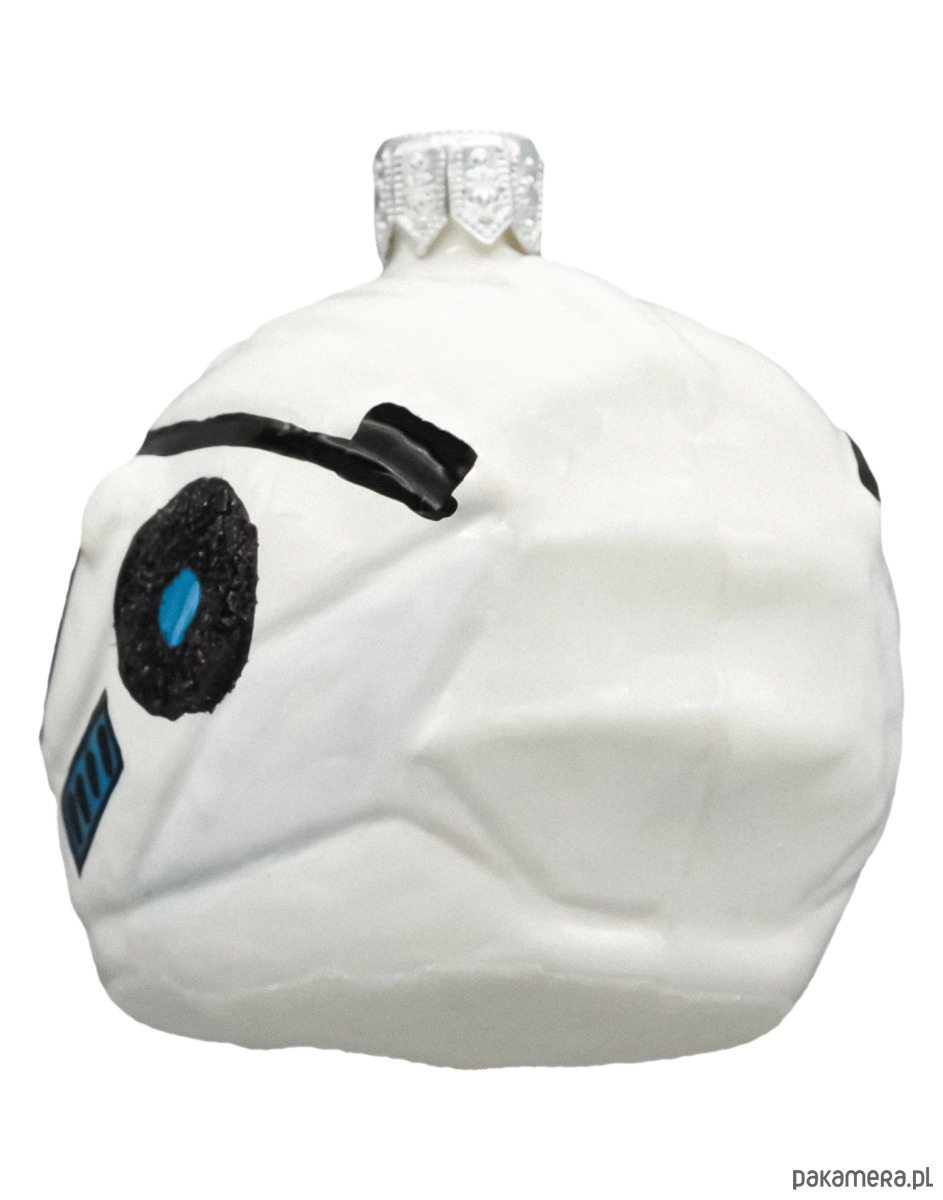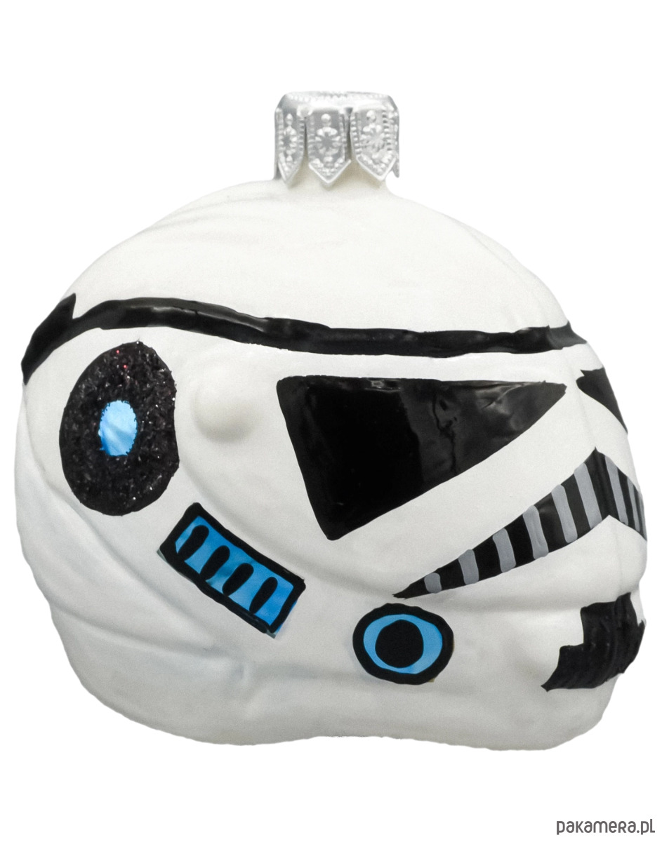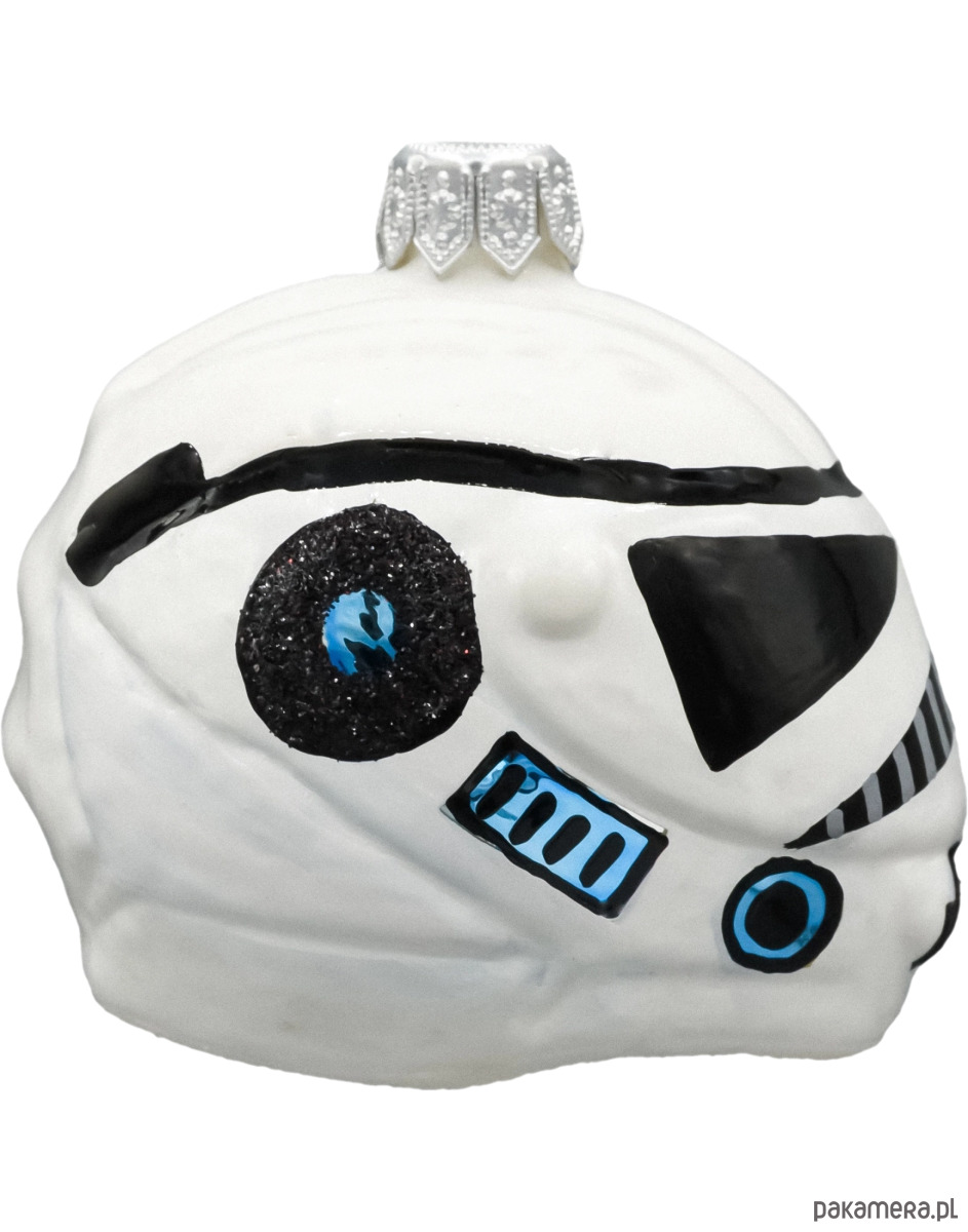 Bombka została wykonana ręcznie ze szkła dmuchanego, a następnie precyzyjnie malowana ręcznie z dbałością o każdy detal. Charakterystyczna biel hełmu kontrastuje z czernią wizjera i geometrycznymi zdobieniami w kolorach czarnym i niebieskim, przywodzącymi na myśl klasyczne zbroje znane z ekranów kinowych. Delikatny połysk lakieru oraz wykończenie z użyciem subtelnego brokatu nadają całości nowoczesny, a zarazem dekoracyjny wygląd.