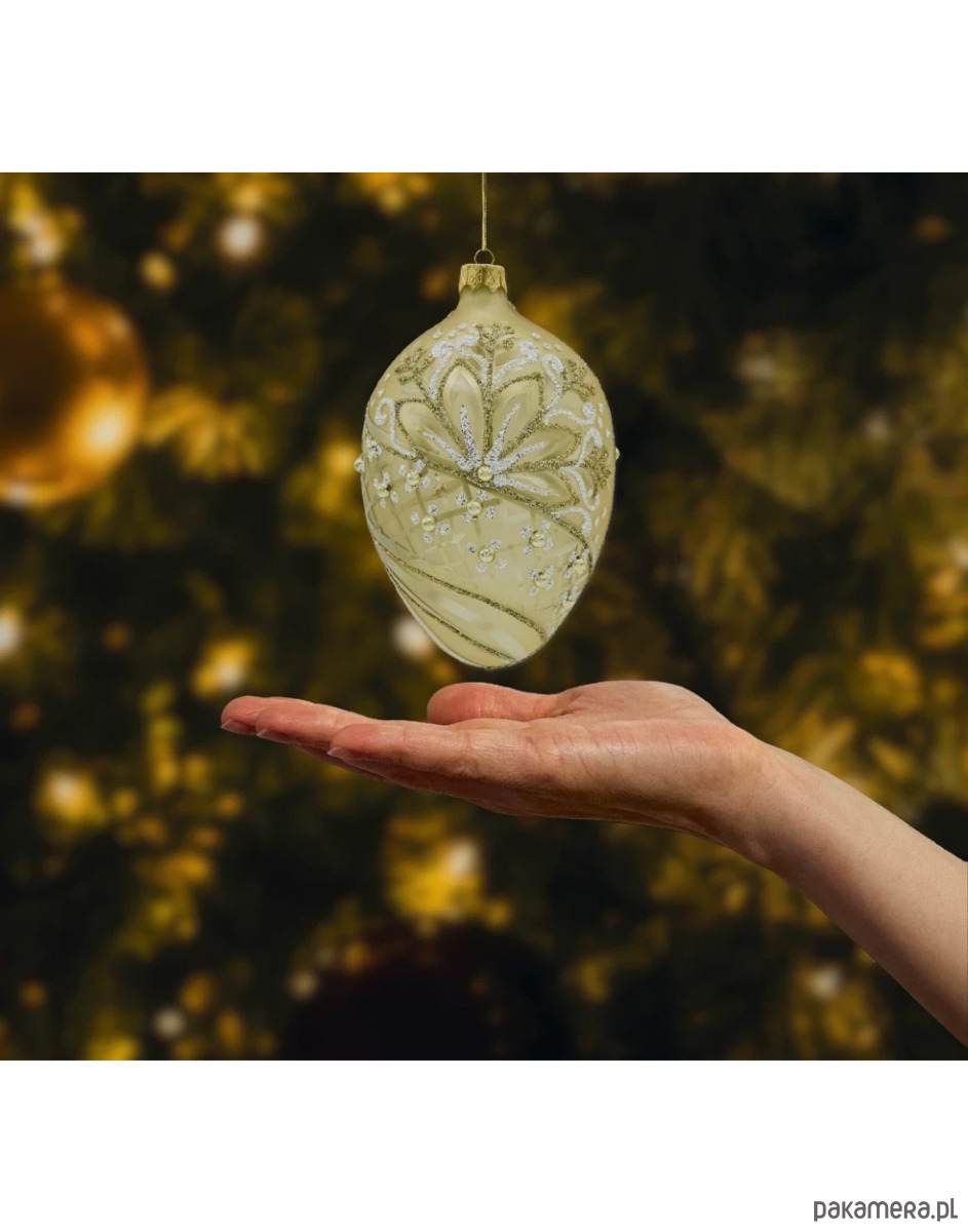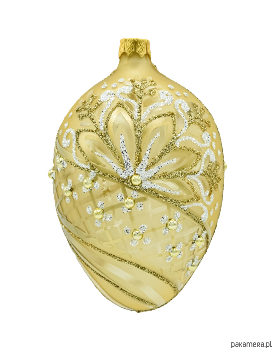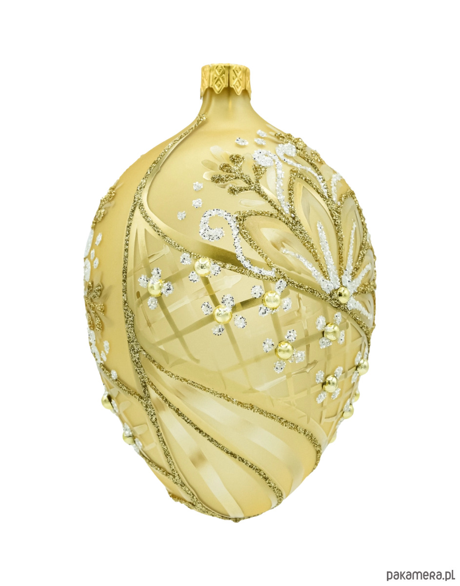 Wytworne szklane jajko w kolorze ciepłego złota to ozdoba, która natychmiast dodaje aranżacji klasy premium. Satynowa powierzchnia została ręcznie zdobiona bogatym ornamentem: liście i zawijasy prowadzone złotym oraz białym brokatem, delikatne wypukłe kropki i drobne kuleczki w kolorze złota tworzą elegancki efekt 3D. Na korpusie widać subtelne, matowo-błyszczące przecierki i siateczkę, które pięknie łapią światło lampek. To idealna bombka w kształcie jaja do stylu glamour i klasycznych, złotych kompozycji.
