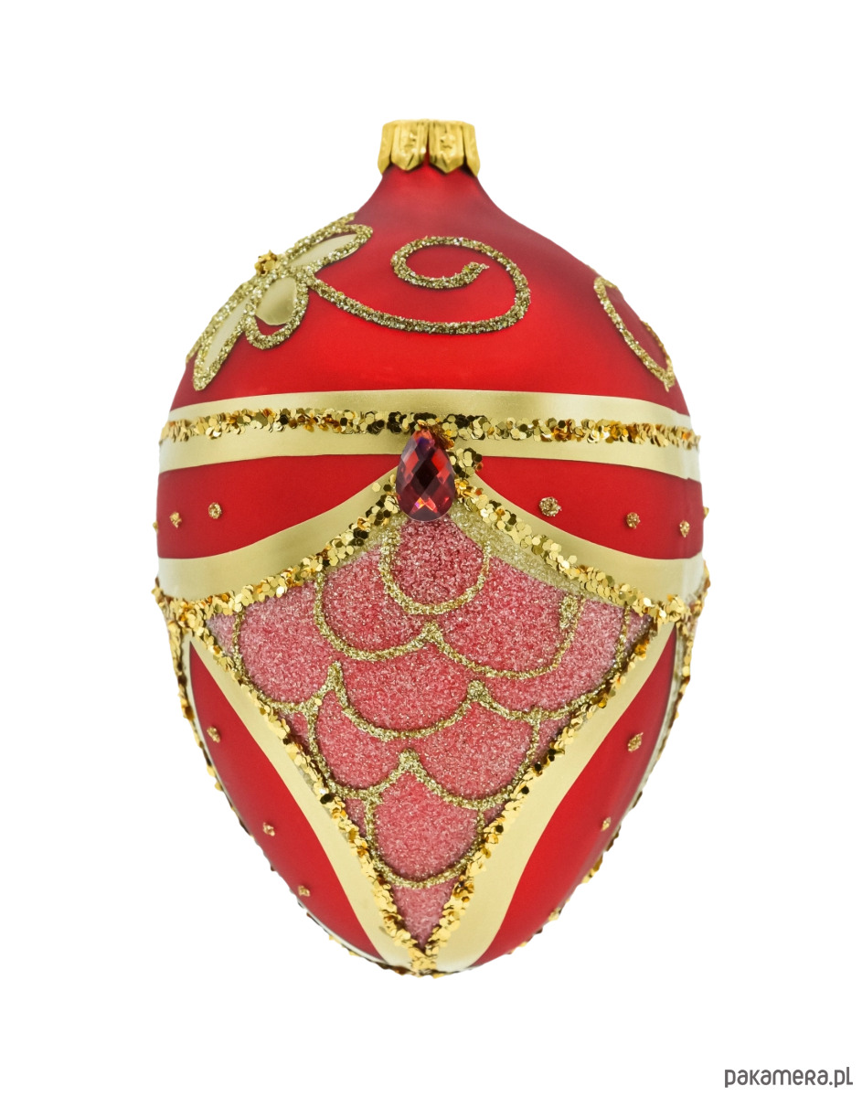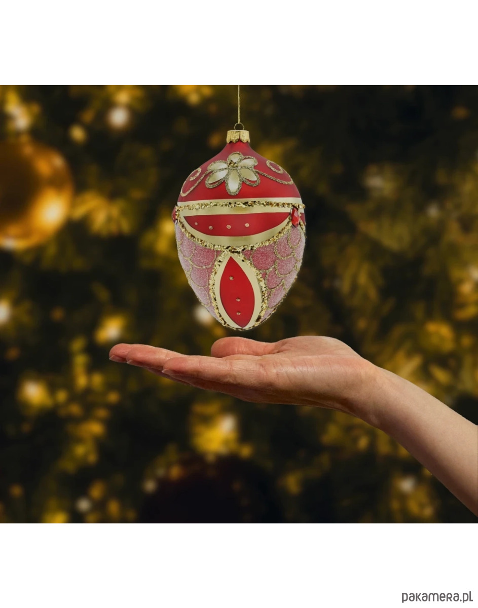 Elegancka bombka szklana w formie jajka to prawdziwa perełka w stylu glamour. Matowa, głęboka czerwień została zestawiona ze złotymi pasami i misterną aplikacją z brokatu i połyskujących cekinów, które tworzą efektowne „łuski” na środkowym pasie. Całość domykają fasetowane kamienie w odcieniu rubinu, przyciągające światło niczym biżuteria. To dekoracja, która od razu nadaje choince luksusowego, pałacowego charakteru – idealna do klasycznych aranżacji w odcieniach czerwieni i złota, ale równie pięknie zagra w towarzystwie zieleni, bieli i ciepłych światełek.