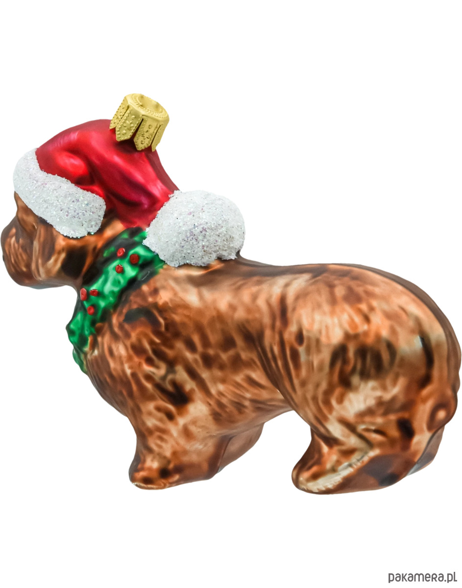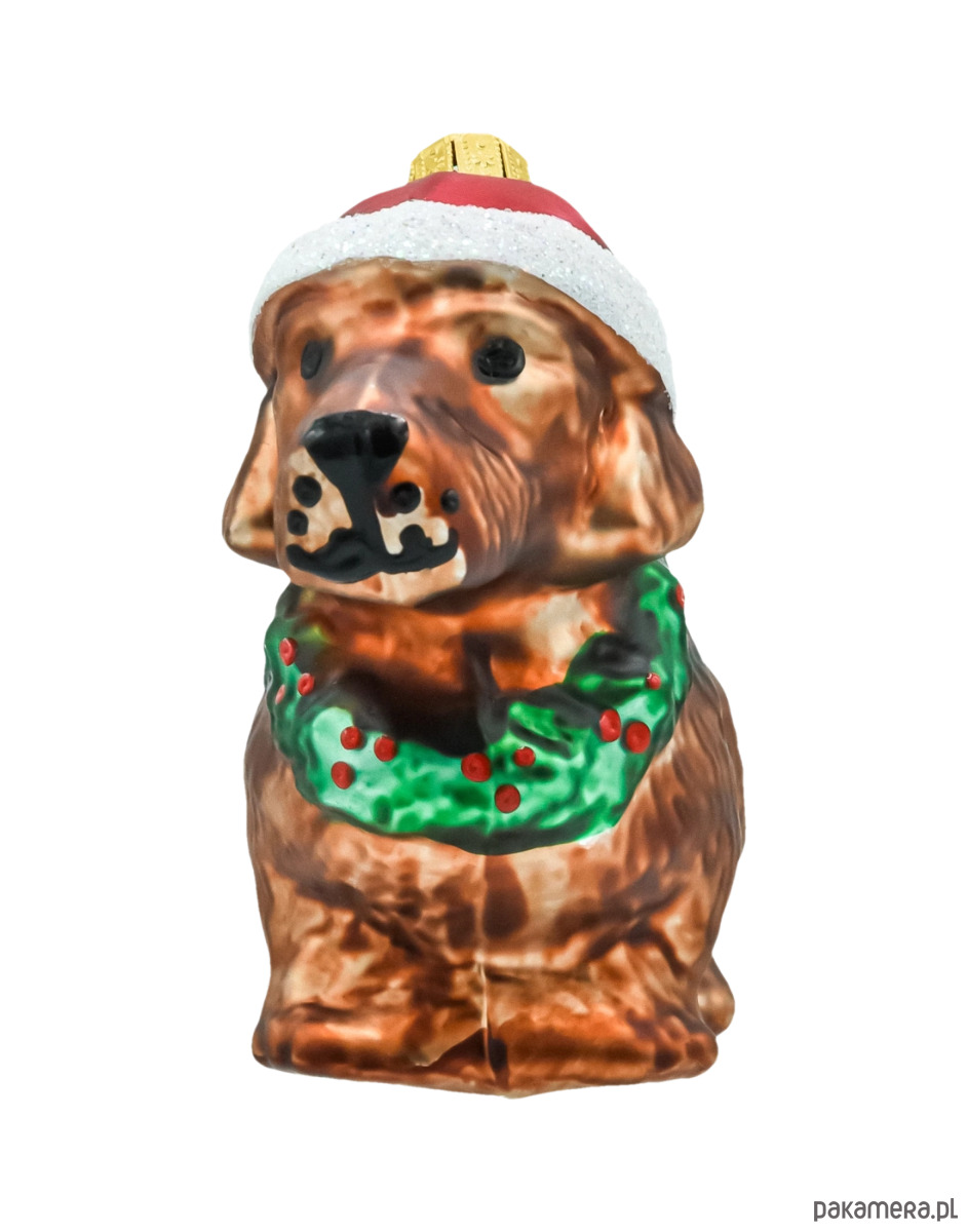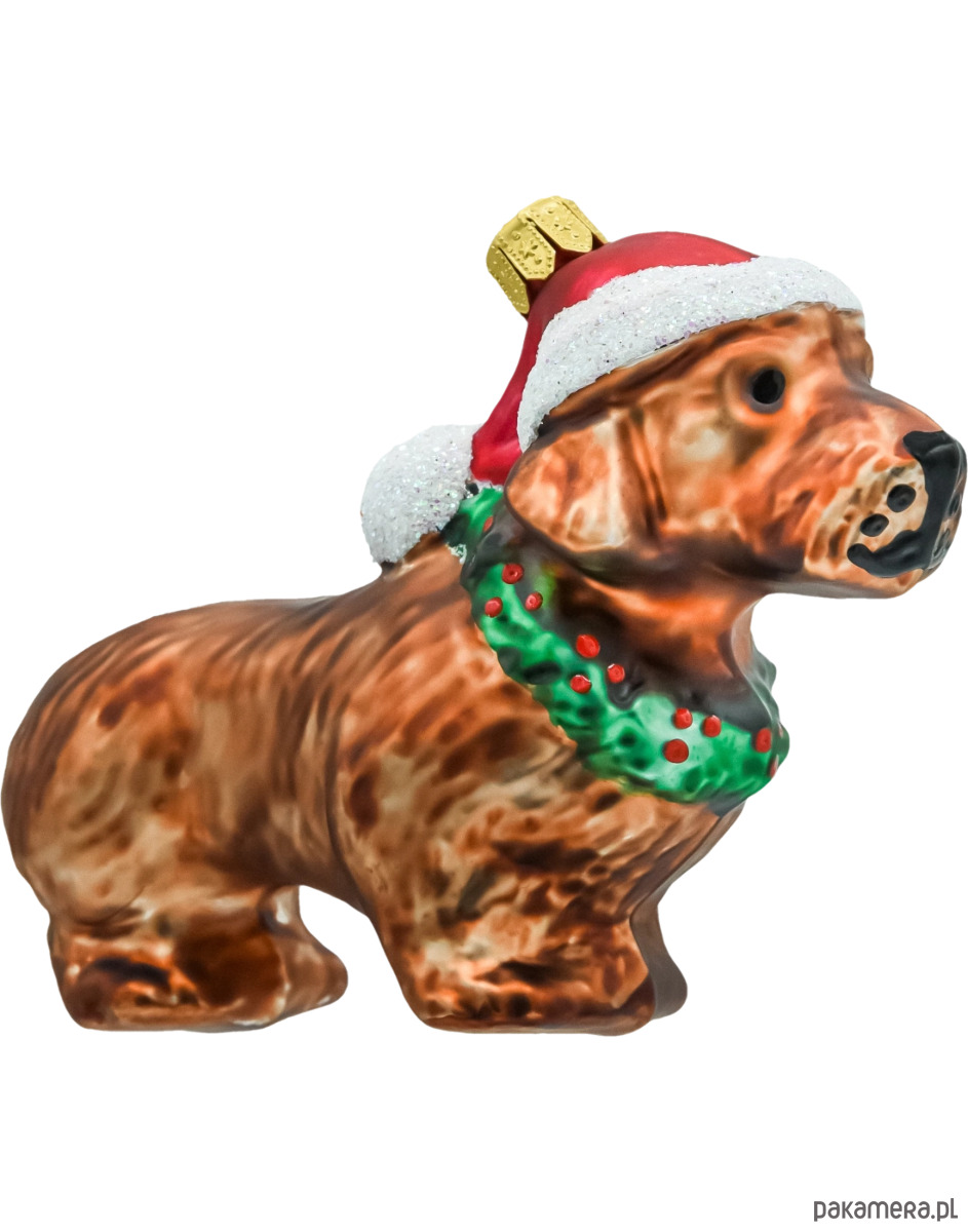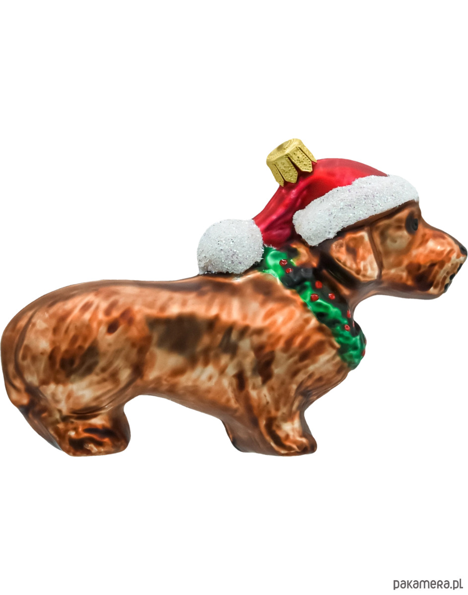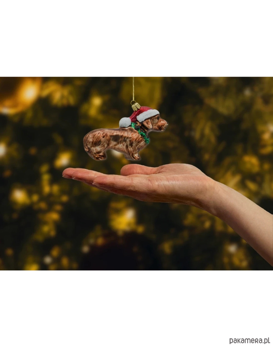 Ta urocza bombka szklana w kształcie pieska–jamnika wnosi na choinkę odrobinę ciepła i humoru. Błyszcząca, miedziano-brązowa „sierść”, czapka Mikołaja z iskrzącym „śniegiem” oraz zielony, świąteczny wieniec z czerwonymi jagódkami tworzą elegancką, a jednocześnie pełną uroku kompozycję. To idealna ozdoba świąteczna dla miłośników psów, dzieci i wszystkich, którzy lubią nietuzinkowe, ręcznie zdobione bombki.