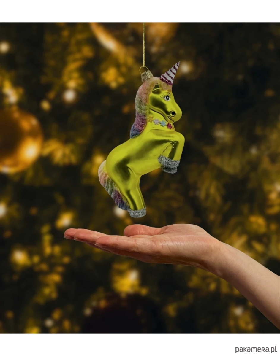 Szklana bombka choinkowa w kształcie złotego jednorożca to wyjątkowa ozdoba, która wprowadzi magiczny klimat do Twojej świątecznej aranżacji. Starannie wykonane detale, żywe kolory i ręczne zdobienia czynią tę bombkę jedyną w swoim rodzaju. To idealny wybór na prezent dla dzieci, fanów baśniowych motywów oraz wszystkich tych, którzy pragną dodać swojej choince odrobinę niezwykłości i blasku.