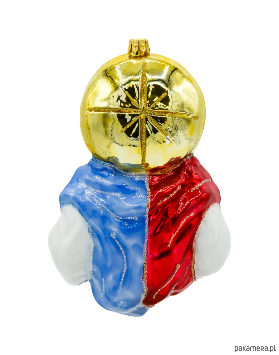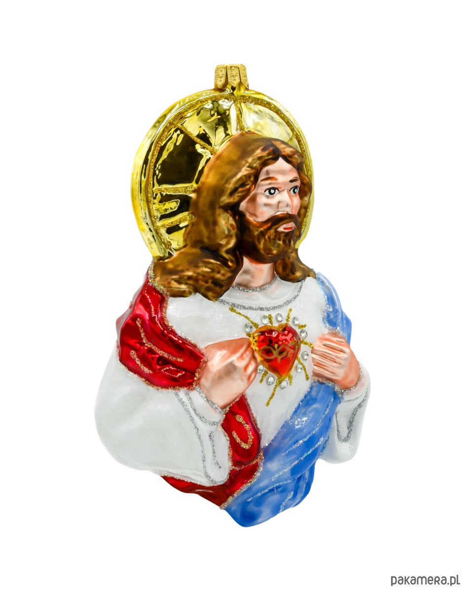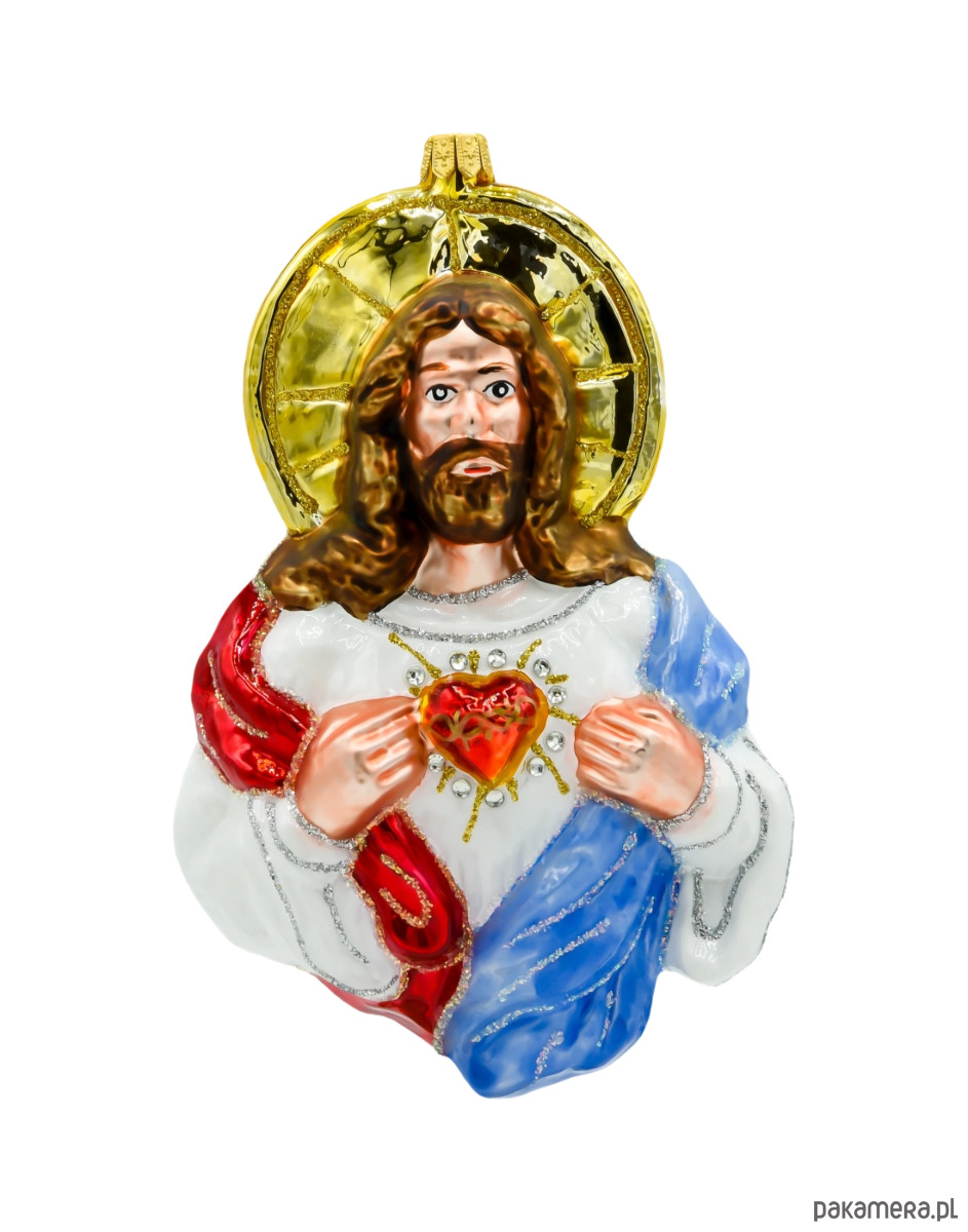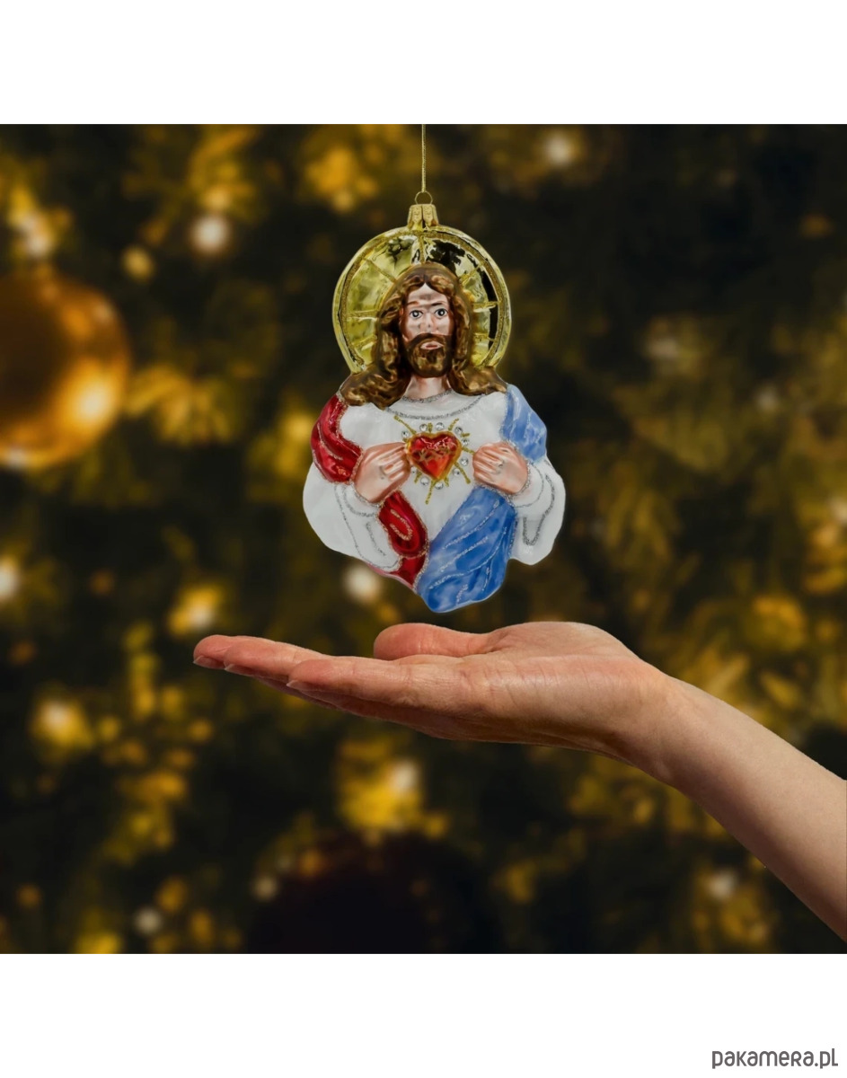 Szklana bombka choinkowa „Najświętsze Serce Jezusa” to wyjątkowa ozdoba świąteczna, która łączy głęboką symbolikę religijną z kunsztem ręcznego wykonania. Figurka przedstawia Jezusa Chrystusa z charakterystycznym złotym nimbem oraz promieniującym Najświętszym Sercem, otoczonym promieniami i maleńkimi, połyskującymi kryształkami. Jezus ubrany jest w biało-czerwono-niebieską szatę ozdobioną srebrzystym brokatem, który pięknie odbija światło choinkowych lampek. Złota aureola wieńcząca bombkę symbolizuje boskość i wieczność, a wyraz twarzy figury emanuje spokojem i miłością.