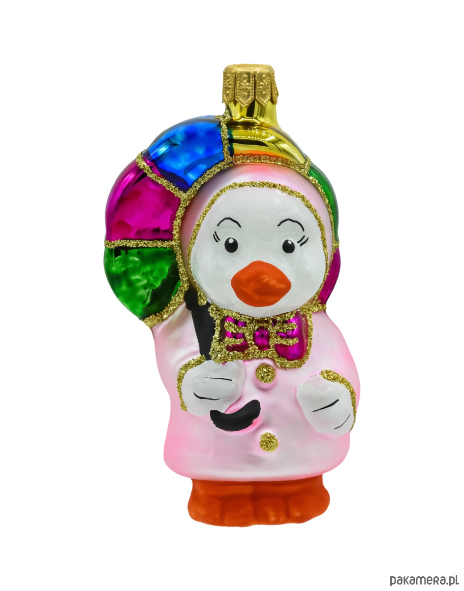 • Rodzaj: bombka szklana – figurka kaczuszki z parasolką.