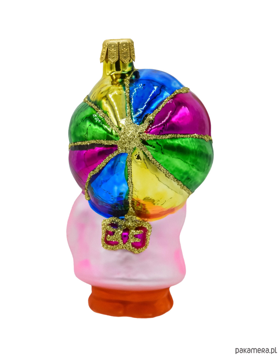 Urocza, ręcznie zdobiona bombka z dmuchanego szkła przedstawiająca kaczuszkę w różowym płaszczyku i z wielobarwną parasolką. Lśniące segmenty parasolki (zieleń, niebieski, fuksja, złoto) podkreślono złotym brokatem, a pomarańczowy dziób i „buciki” dodają figurce ciepłego, bajkowego charakteru. To idealna bombka choinkowa figurka do kolorowych aranżacji w stylu retro i do kolekcji szklanych bombek świątecznych.