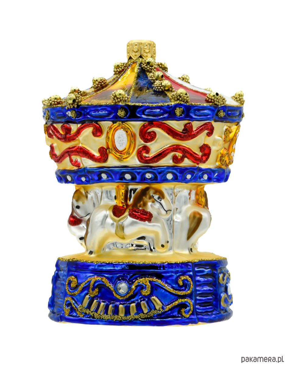 Konstrukcja bombki składa się z dwóch poziomów – złotego podium z konikami i bogato zdobionego daszku z detalami w kolorach czerwonym, złotym i niebieskim.