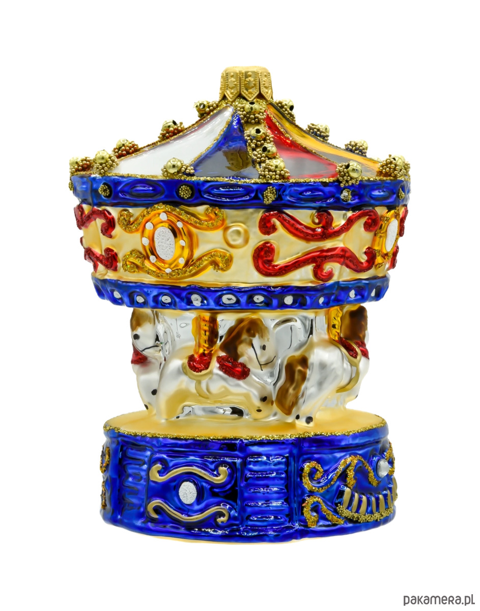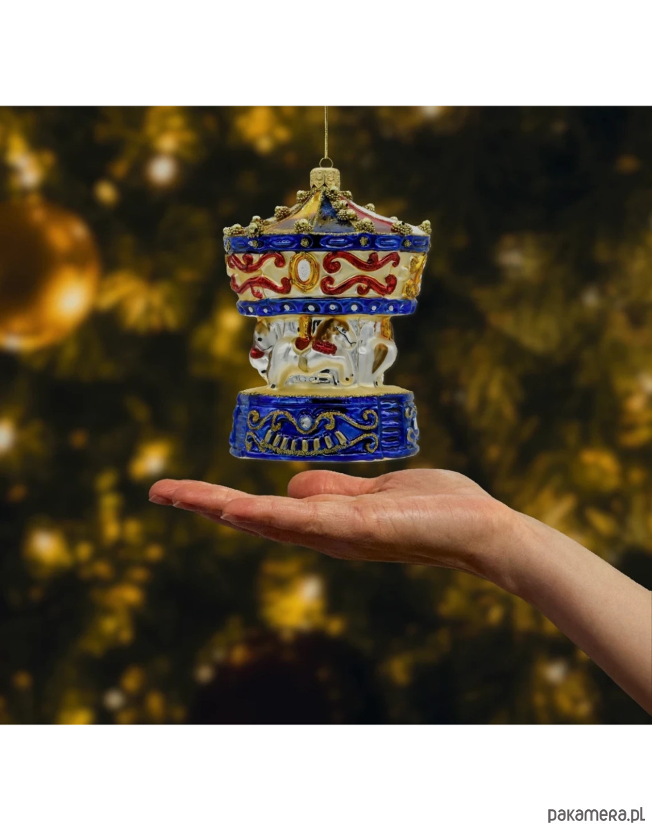 Bombka przedstawia klasyczną karuzelę z konikami, która jest symbolem dziecięcej radości i beztroskich chwil.