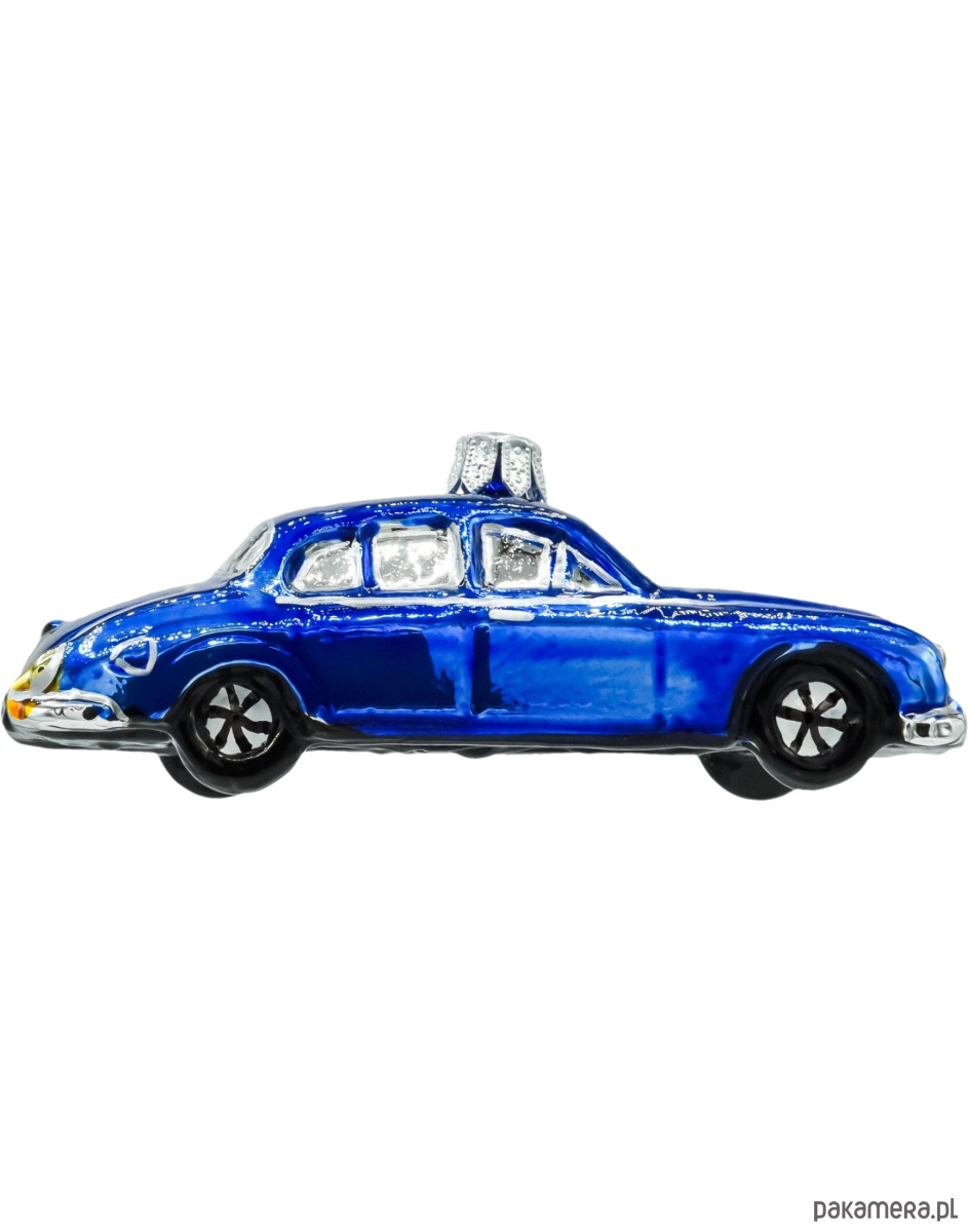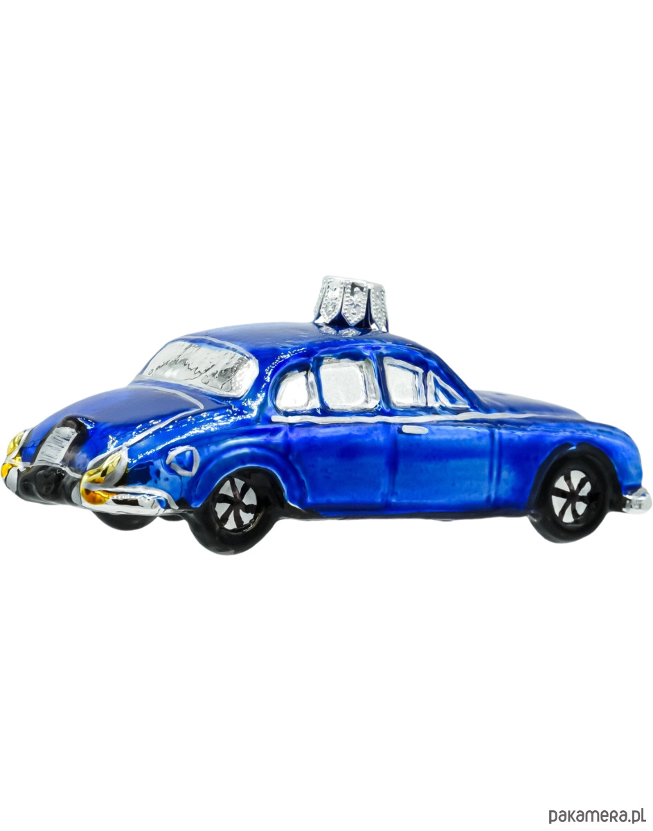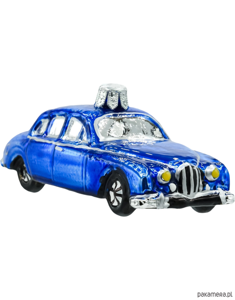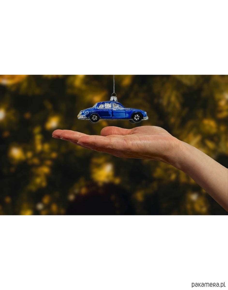 Design: Bombka przedstawia klasyczny, stylowy samochód w kolorze głębokiego błękitu, z realistycznymi, srebrnymi elementami oraz starannie odwzorowanymi szczegółami, takimi jak reflektory, lusterka i opony.