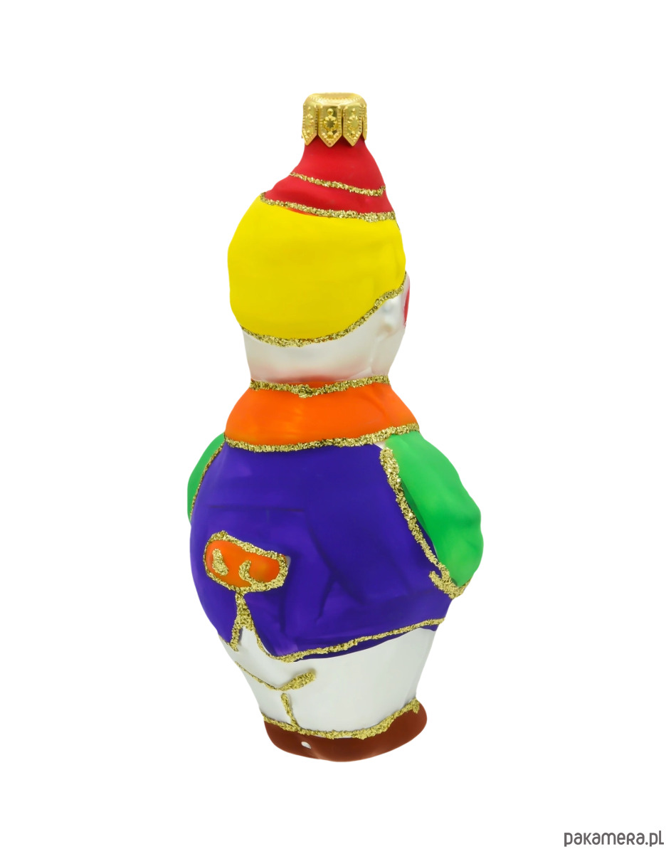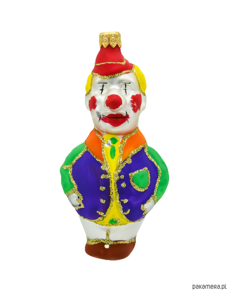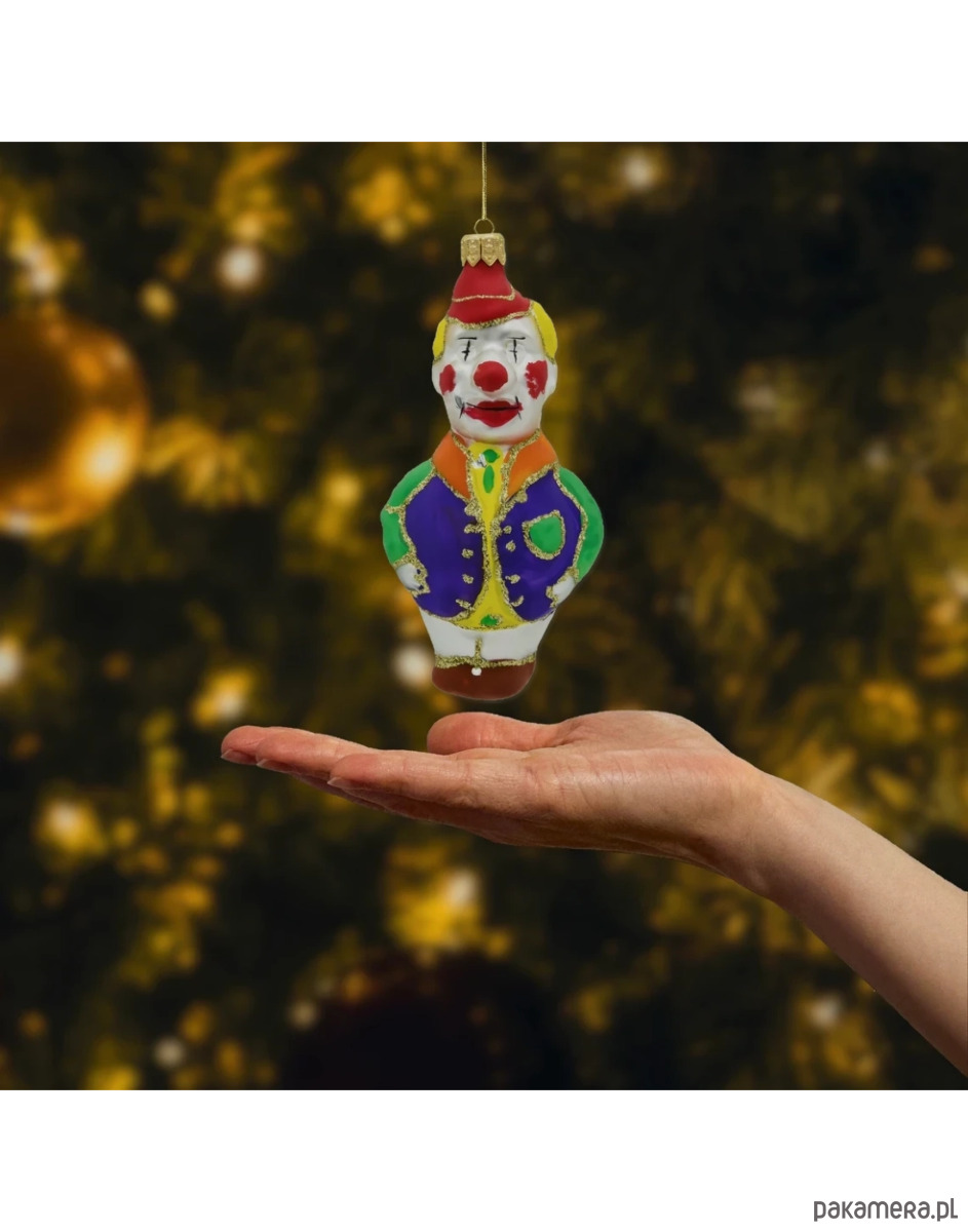 Dodaj odrobinę szaleństwa i humoru do swojego świątecznego wystroju z unikalną bombką choinkową w kształcie klauna! Ta ręcznie wykonana ozdoba to prawdziwe dzieło sztuki – przyciąga uwagę intensywną kolorystyką, wyrazistymi detalami oraz finezyjnym wykończeniem. Klaun ubrany w jaskrawozielony, fioletowy i pomarańczowy frak z brokatowymi zdobieniami, czerwonym nosem i charakterystycznym makijażem tworzy niepowtarzalny efekt wizualny, który natychmiast wprawia w radosny nastrój.