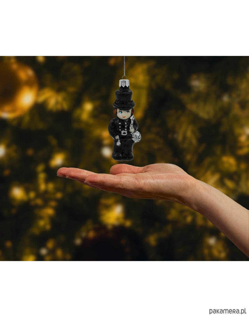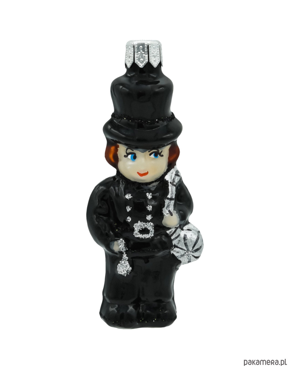 Wprowadź odrobinę świątecznego uroku i tradycyjnego symbolu szczęścia na swoją choinkę dzięki tej wyjątkowej bombce choinkowej w kształcie kominiarza. Wykonana ze szkła dmuchanego i ręcznie malowana, ta urocza figurka przedstawia klasycznego kominiarza w czarnym stroju z charakterystycznym cylindrem, z uśmiechem na twarzy i narzędziami pracy – w tym błyszczącą, srebrną drabiną i liną z kulą.